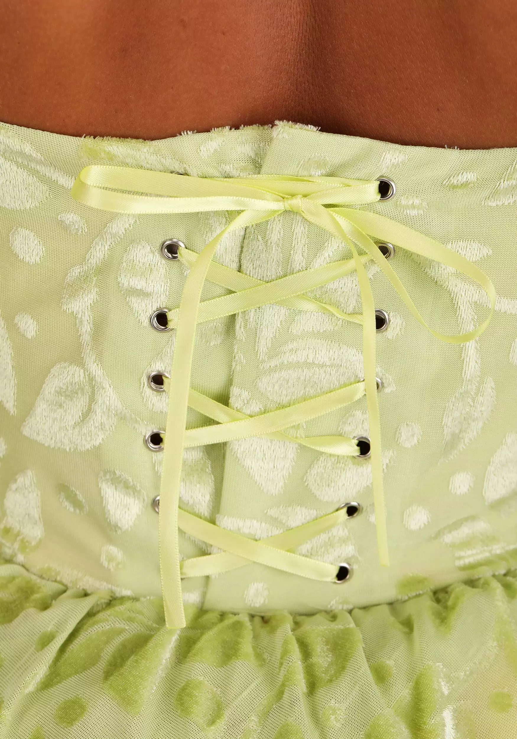 - Green velvet flower vine secured to the waist has posable wire, yellow velvet flower on the waist