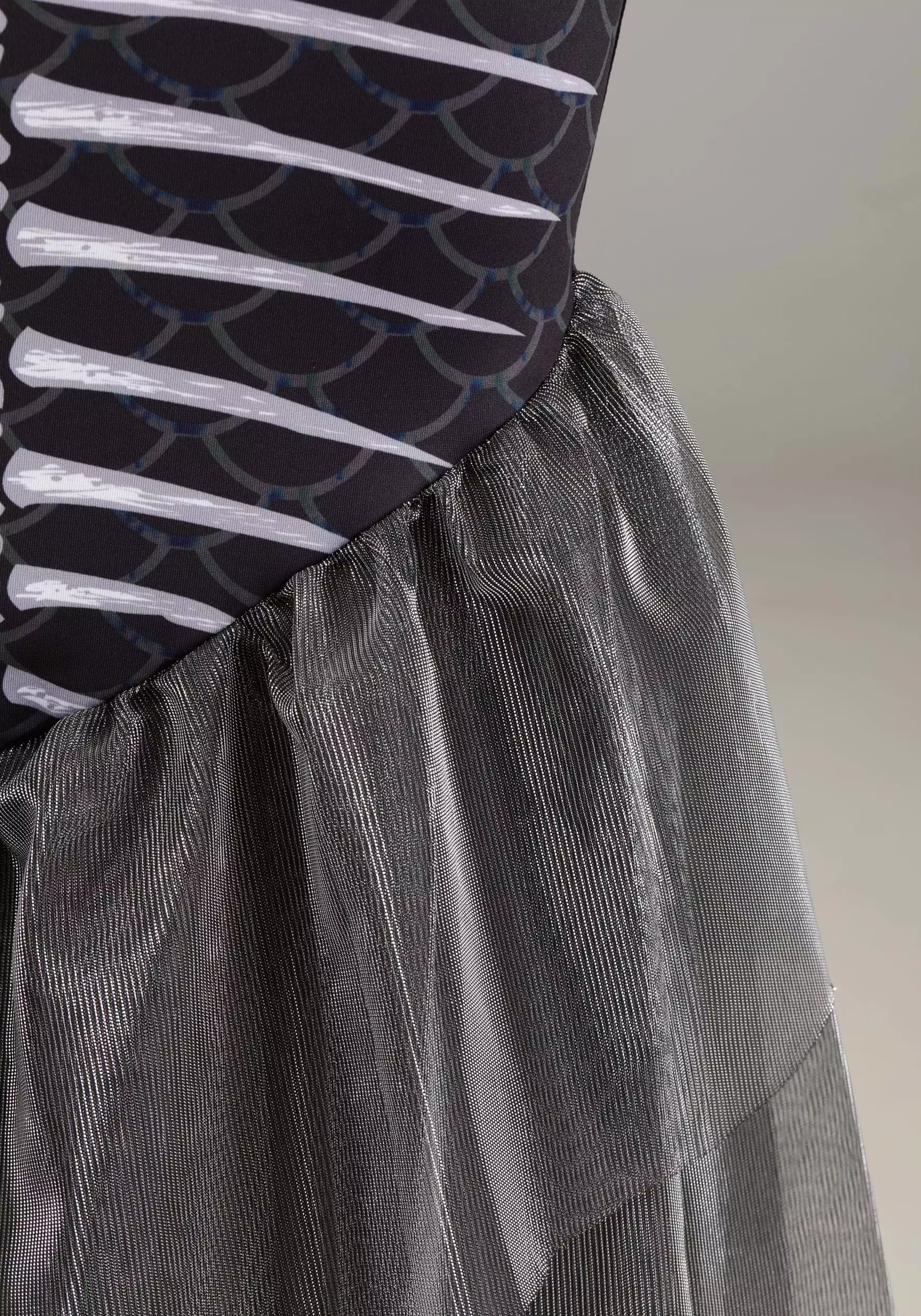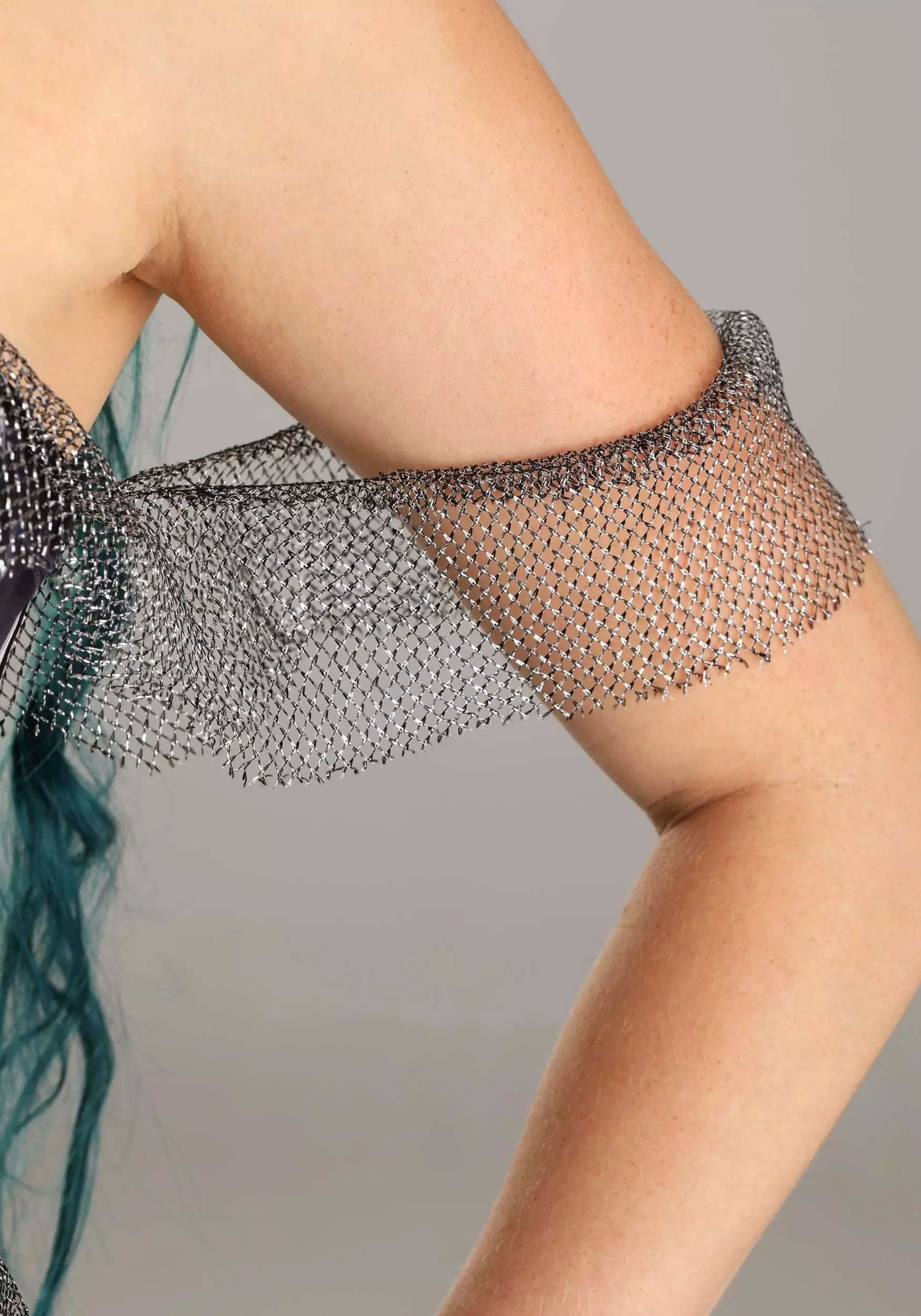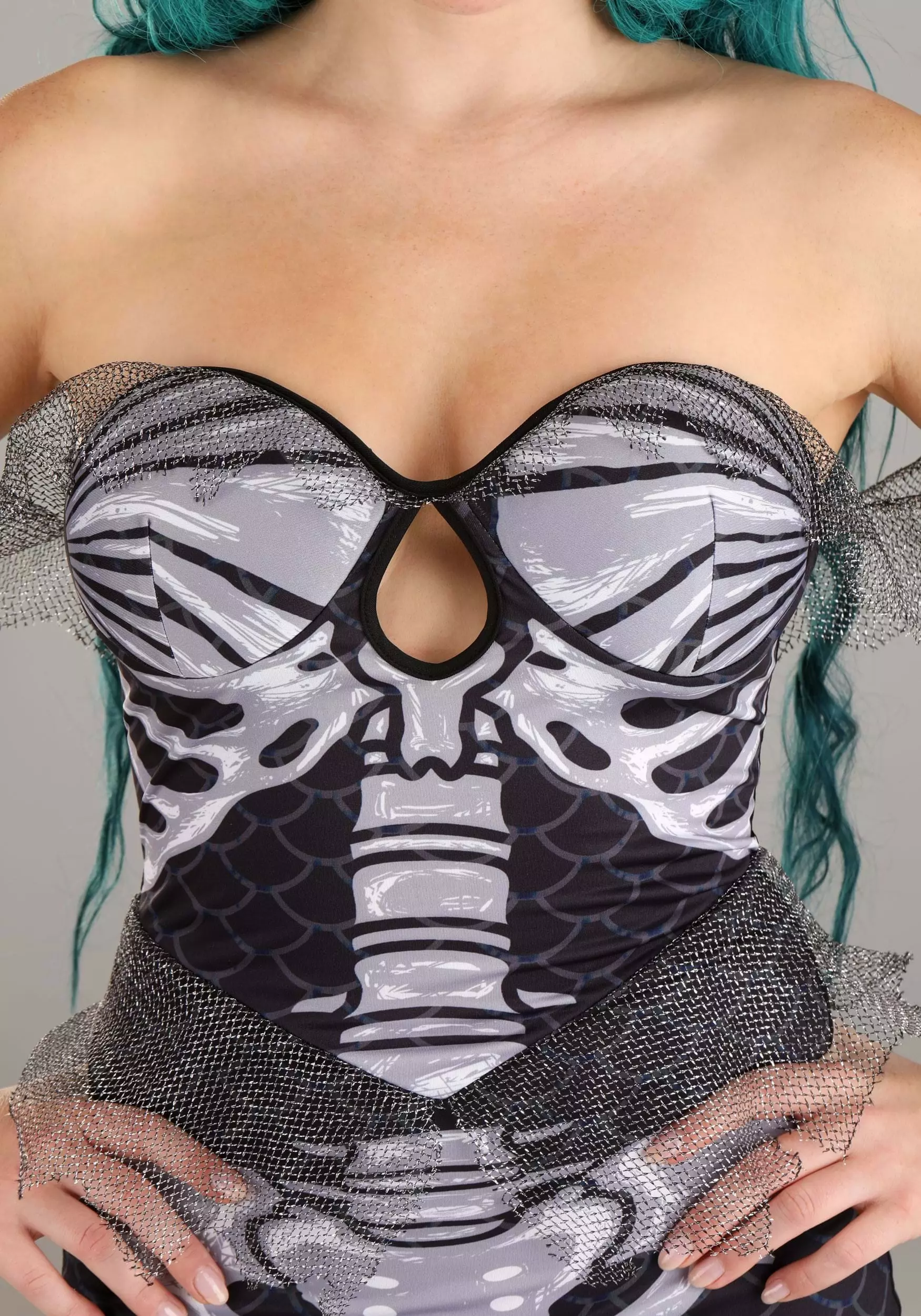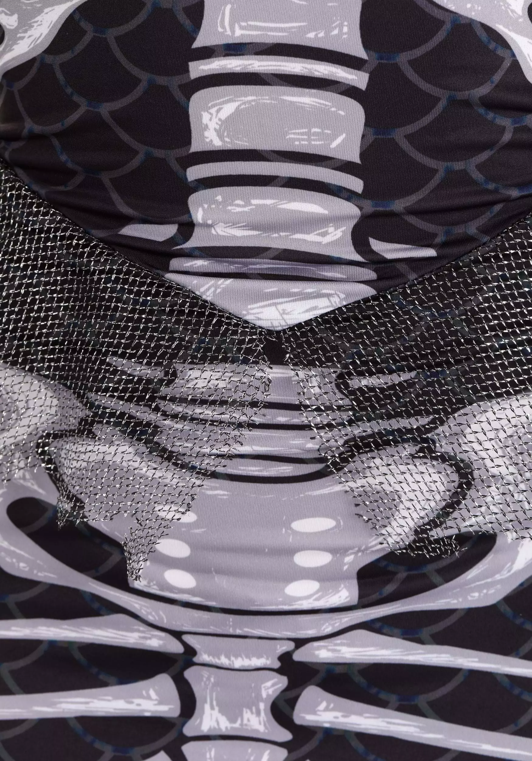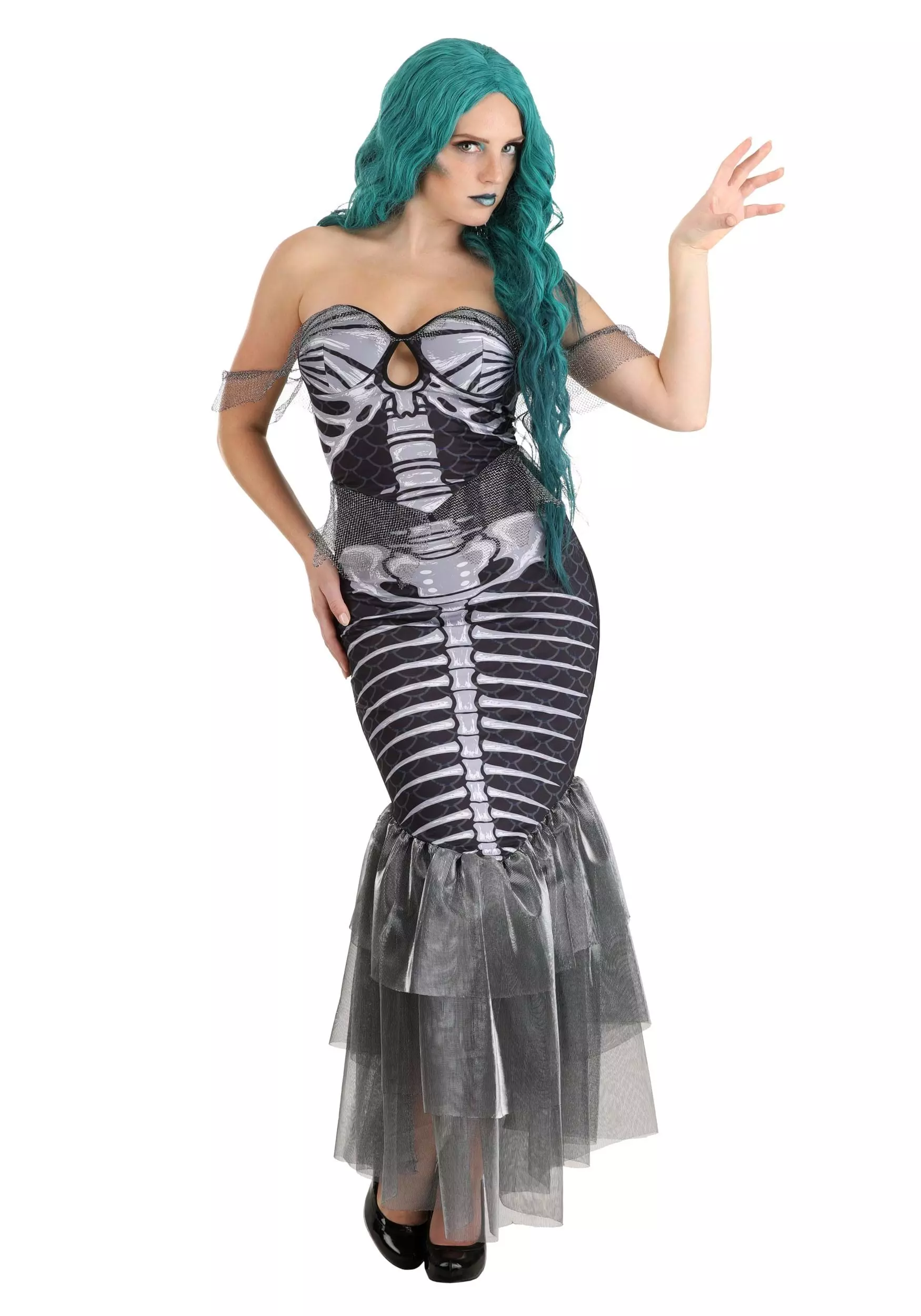 You’ll be lethally lovely in this exclusive Spooky Siren Costume for Women! The strapless mermaid-style gown zips up the back and hugs your sides, hips, and upper legs before fanning out in a whirl of layered silver mesh ruffles. The front of the gown is printed with a fishlike skeleton including spine, hips, and tailbones on top of a background of black scales. Off-the-shoulder mesh sleeves match the bottom of the skirt, as does the mesh “fin” detail at the waist.Â