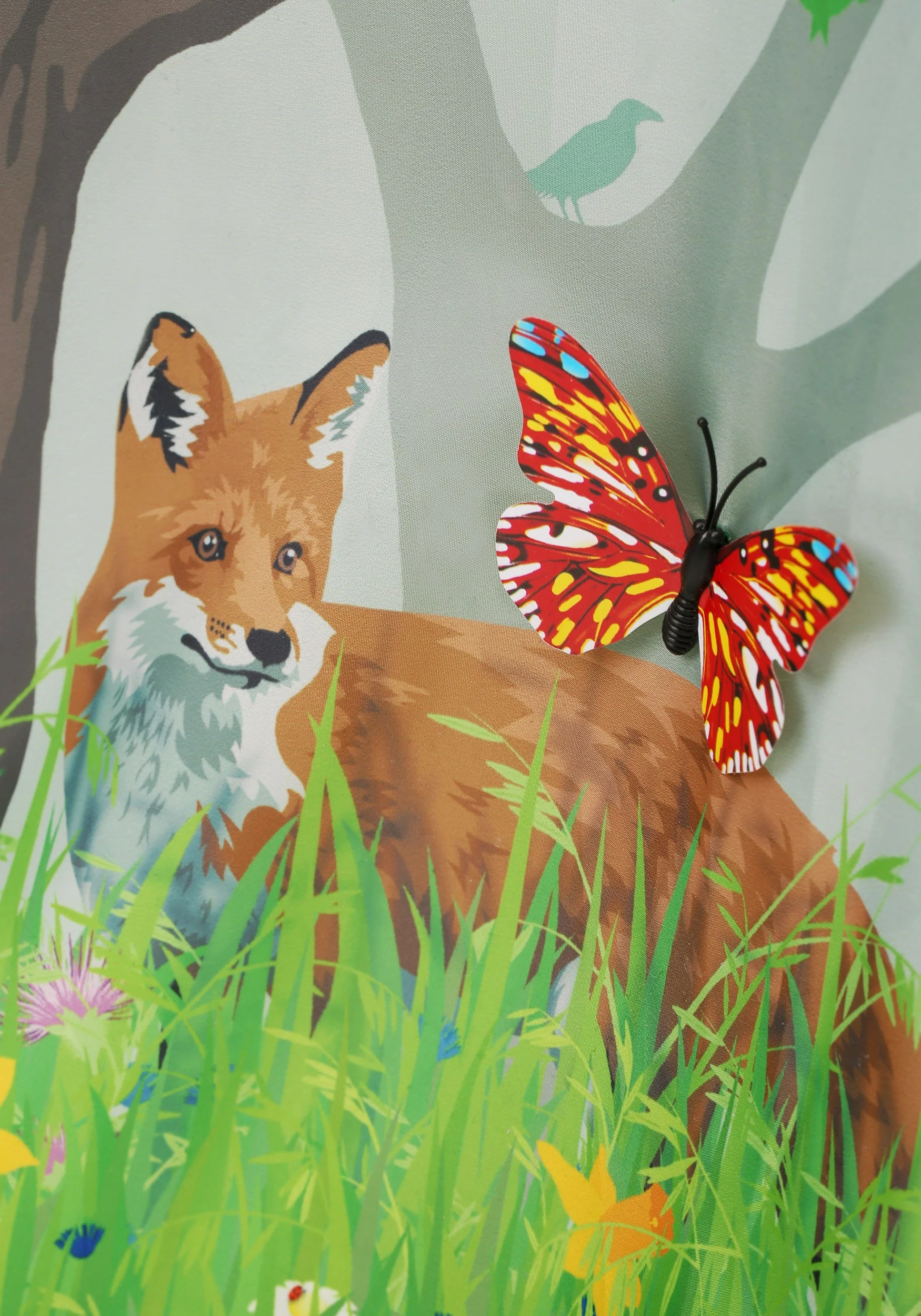 - Metal headband has chiffon flowers, plastic butterflies and a bird nest attached