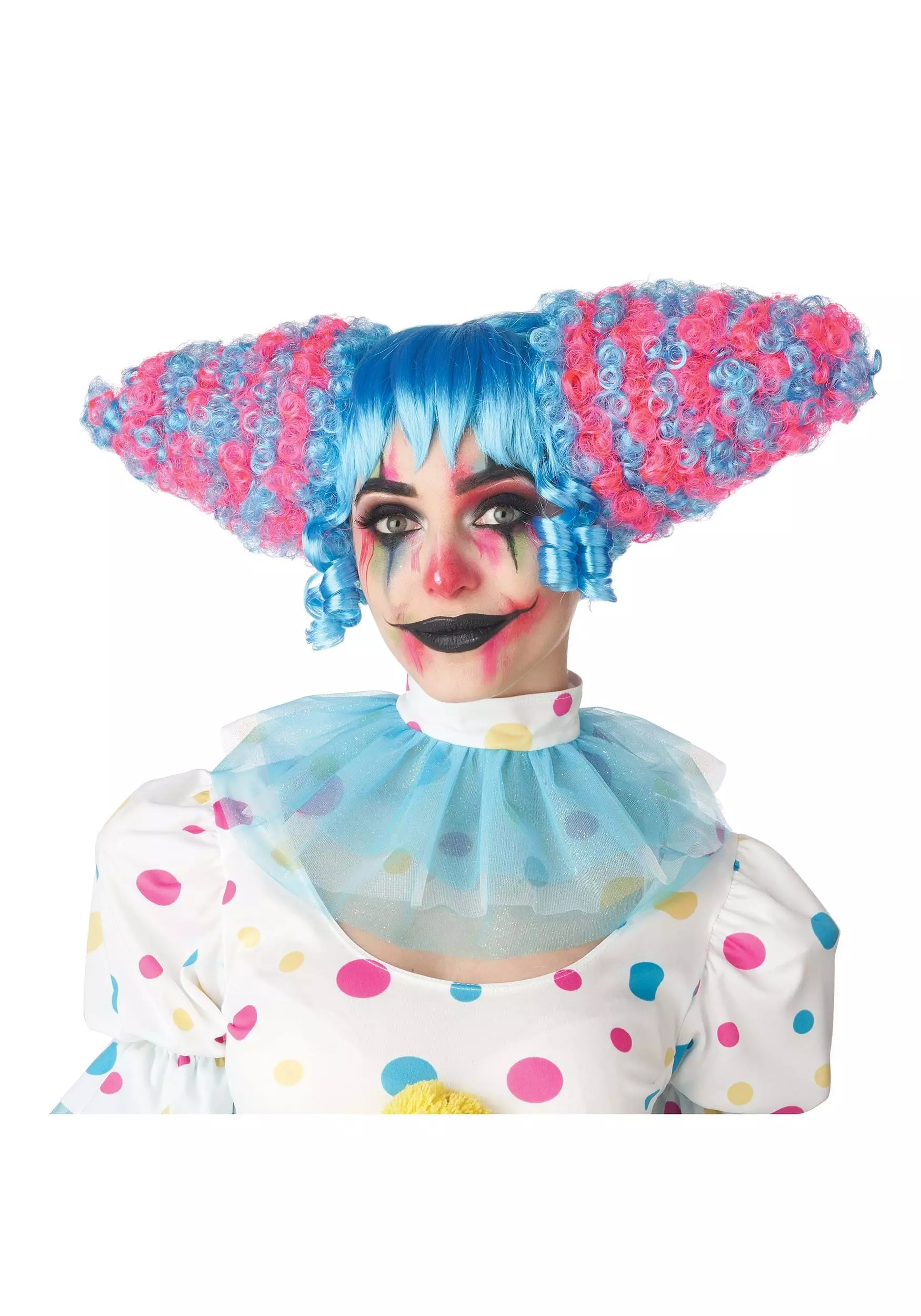 This amazing concoction of CLOWN-like proportions is based on a mesh wig cap with an elastic edge for a snug fit. The cap is topped with blue hair and bangs, as well as matching curly tendrils at the temples. But the showstopper is the bright pink and blue cotton-candy-inspired bouffant — two cones coming off the sides — that make this wig a total eye-catcher!