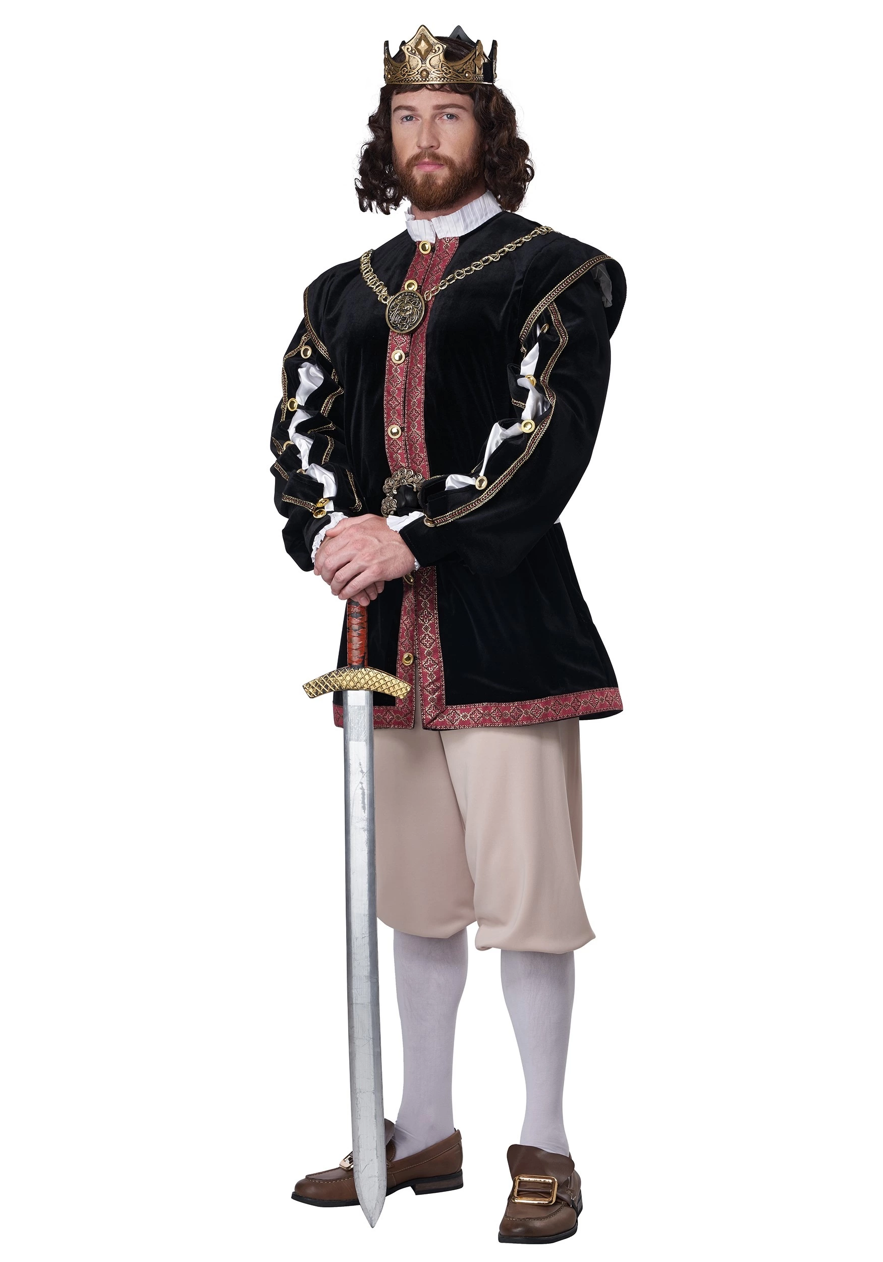 Aside from those three main components, a handful of accessories also come with this costume. You will be suited with a faux leather belt that has a decorative buckle. A spiffy necklace that attaches to the shoulders of the jacket will look like your royal family’s heirloom along with the attached lion medallion. Finally, what is a king without his crown? He’s just another nobleman a.k.a. a NOBODY.