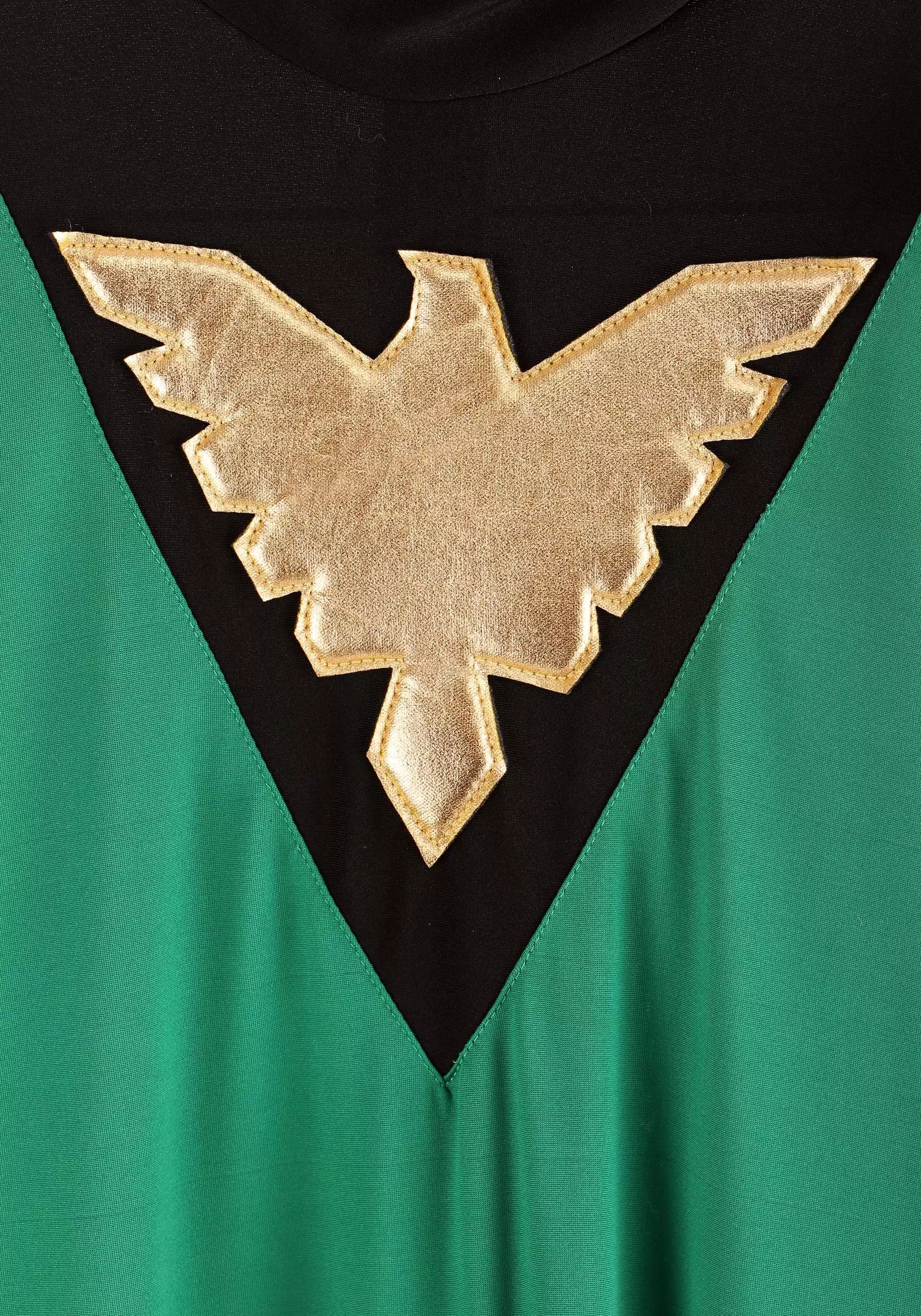 This Jean Grey Phoenix costume faithfully recreates her look from the Marvel comics. It comes with the green, form-fitting bodysuit, which has a gold Phoenix emblem on the front. It also comes with a pair of shimmering gold boot tops that you can wear over your favorite pair of heels. The matching gold gloves give your hands a heroic look and the matching gold waist sash cinches the look, making you feel like a fierce comic book superhero.