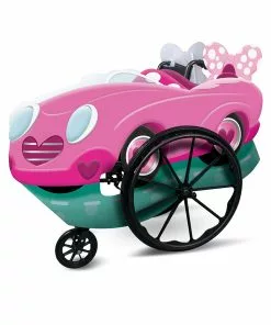 Help your own little Disney Queen scoot around in style when you upgrade her wheelchair with this Adaptive Pink Minnie Mouse Wheelchair Cover costume. This sleek design is felt fabric made to look like a pink car with bright bow seating and delightful heart decals on the hubcaps and front grille. The cover fastens to a wheelchair with hook and loop straps and keeps its shape with plastic support rods that slide into pockets on inside of cover. Combine this with a Minnie Mouse costume for a complete Disney look or use the bright pink car wheelchair cover for any of your other kiddo’s costumes!Â