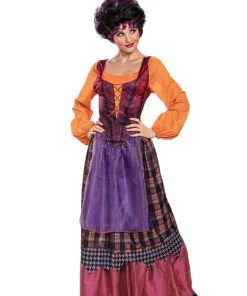 This Hocus Pocus Deluxe Mary Costume consists of a women’s dress, which is styled to look like a corset on top with plenty of printed details. The bright orange mesh sleeves recreate the colorful style worn by Mary in the movie, and the patterned skirt is simply perfect for any witch looking to make a scene in the neighborhood. The purple apron in front really brings the whole look together, giving you an easy costume inspired by the Halloween classic.