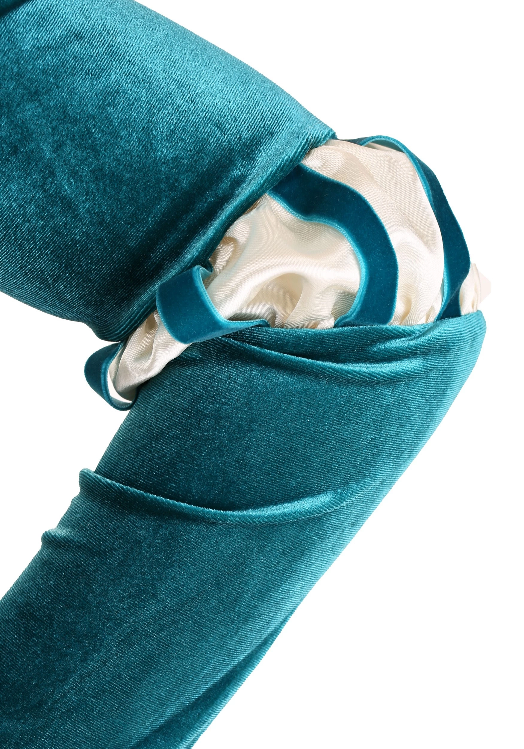 This costume includes Merida’s blue green dress and quiver belt. The long, velvety dress is certainly fit for royalty! The neckline and skirt hem are trimmed in gold embroidery. White fabric rests along the collarbone and wrists, as well as in the shoulder and sleeve cutouts, as if the wearer is dressed in an undershift (as is only proper). The slanted belt comes with the matching brown quiver attached. Looking for more Merida items? We’ve got bows and arrows on our site! As for the hair, you can style a wig, spraypaint your hair, or curl your own locks into wild tresses.Â