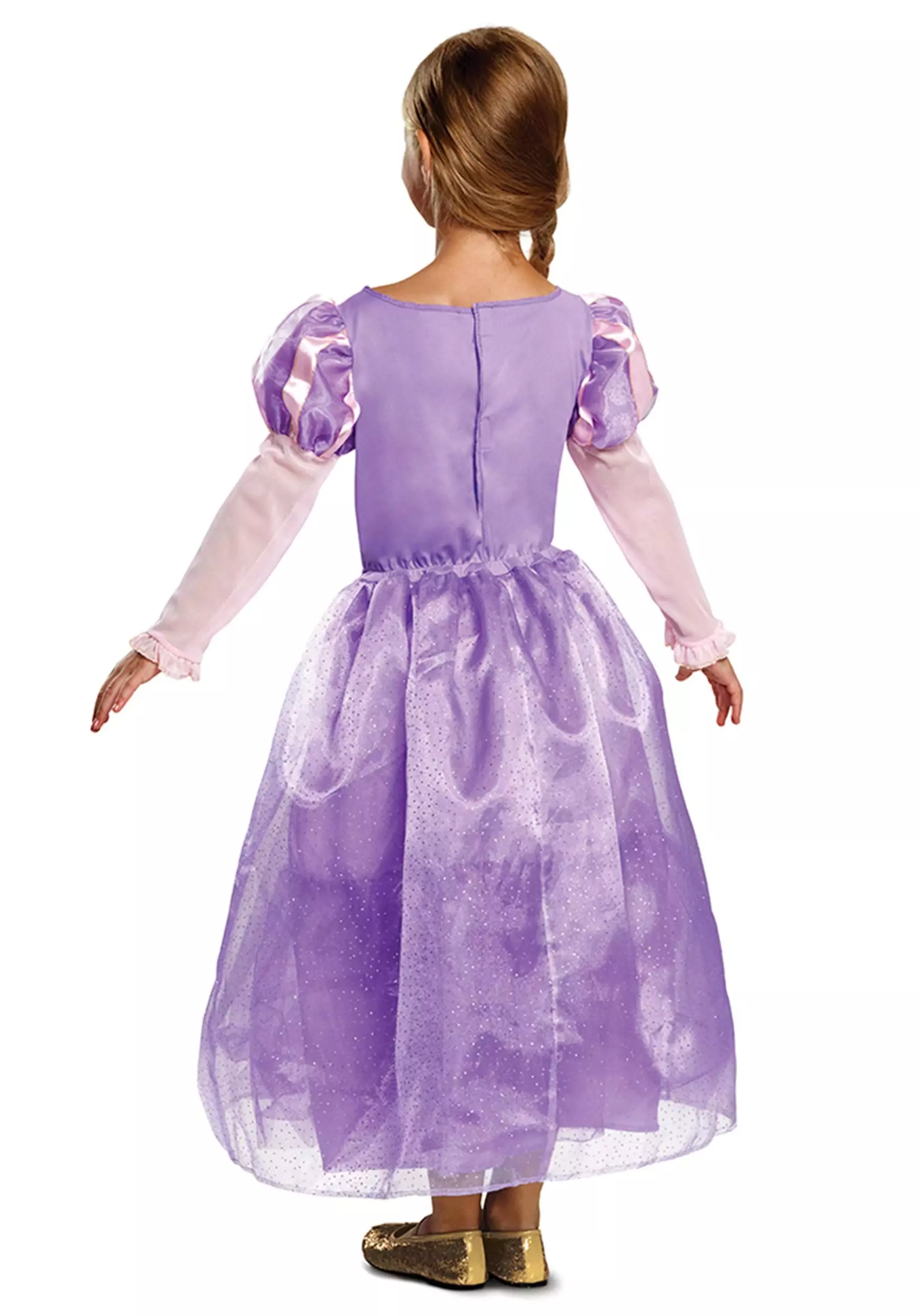 This detailed design is officially licensed and looks like it stepped right off the big screen from Tangled. It is sure to ensnare your kiddo in her wildest fantasies. The purple gown secures via hook and loop closure, and it includes a built-in petticoat for shape. There is corset-style lacing on the bodice and a character cameo on the neckline. Accents like a glittery skirt overlay, puffed sleeves, and pretty ruffles make this costume fit for a princess like yours.