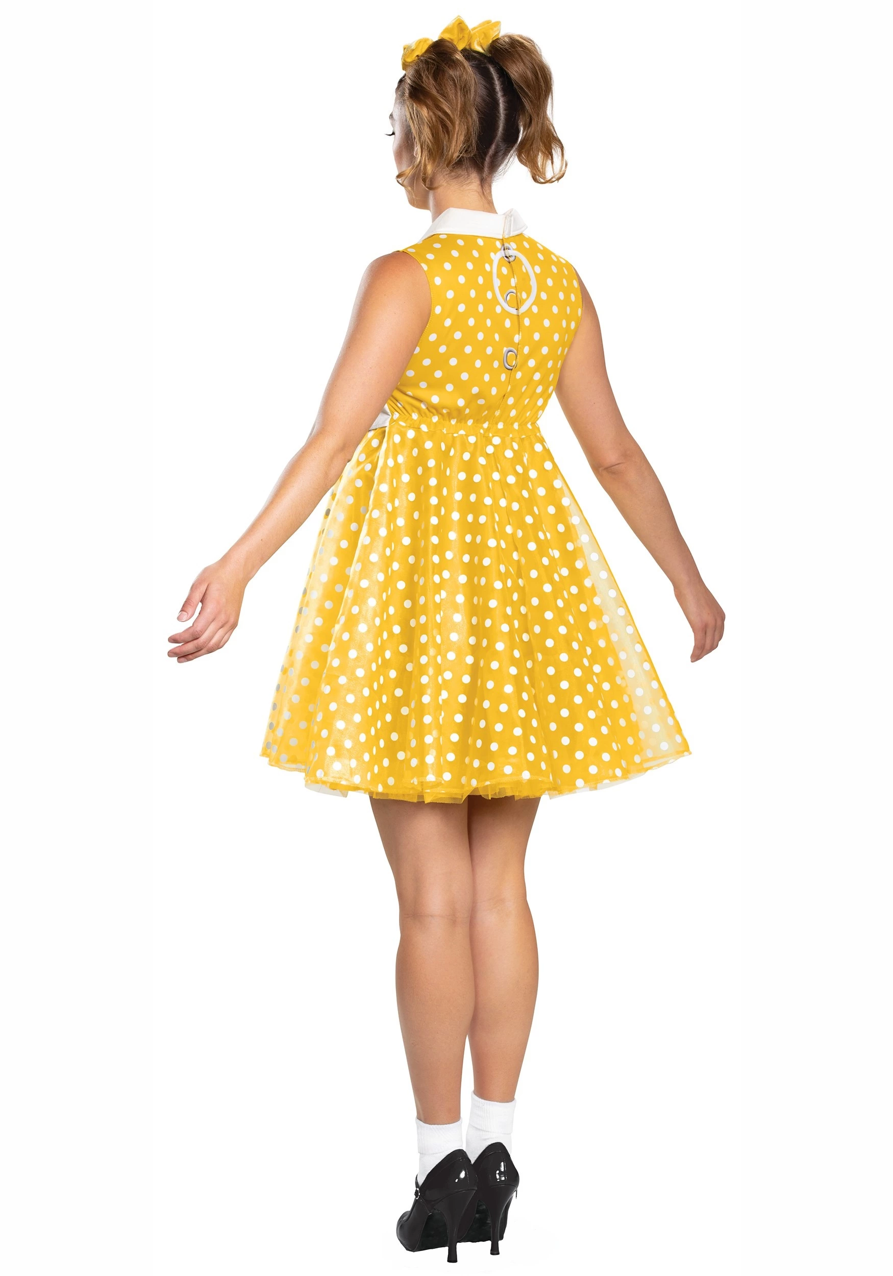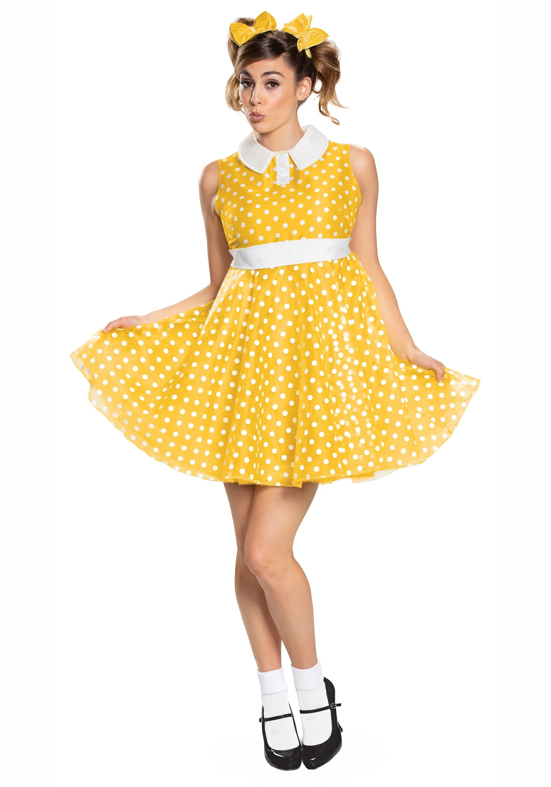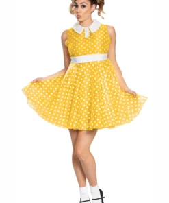 Ready to recite your tea time phrases? A great Gabby Gabby costume will make you ready to hop off the shelf and make new friends. Officially licensed, this Toy Story costume is from the final chapter. The dress has an adorable and flattering baby doll shape. The high cut neck has a curved white collar and high waistband. The skirt flares out, making twirling extra fun. The bright yellow polka dot fabric is adorable, retro, and rather photogenic. Pair this dress with pigtails, white ankle socks, and a character shoe to make yourself tea time ready.Â