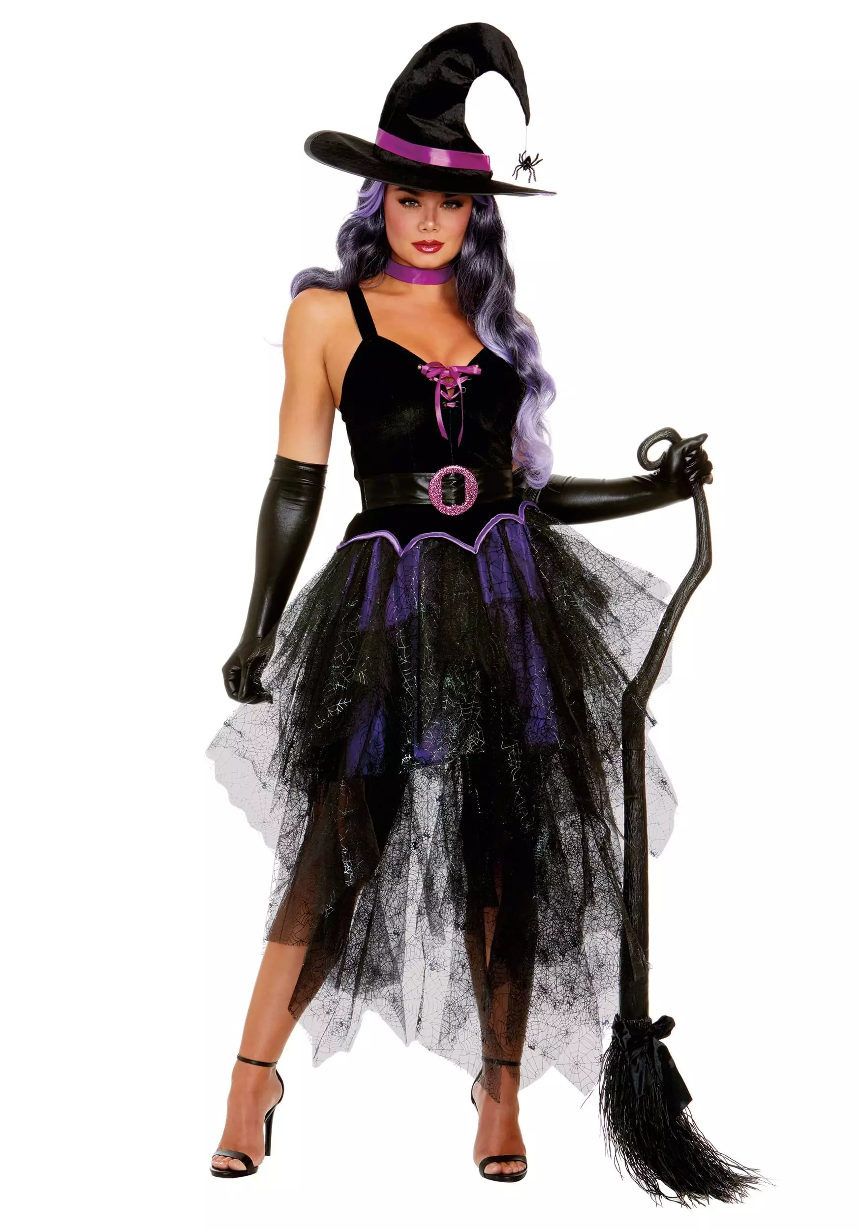 Move over, Wicked Witch of the West – in this stunning Women’s Purple Sexy Witch Costume, there’ll be no doubt that you have the magical power of being gorgeous all the time. The sleeveless black dress has a waist-enhancing black belt with a sparkly purple buckle and a purple miniskirt accented by layers of spiderweb-detailed black netting. A purple ribbon laces up the flattering bodice and the purple ribbon choker and spider-tipped witch’s hat put the finishing touch on a spicy, sorcerous costume!