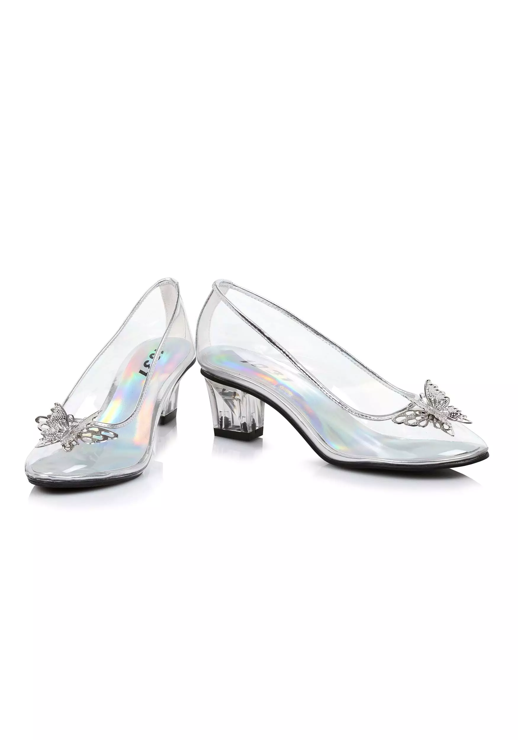 These clear shoes have a low high heel to make them oh-so-danceable. The material has an iridescent shine for a crystal image. The toes are complete with show-stopping silver butterflies. The bottom of the shoes are complete with anti-skid rubber, making your fairy tale shoes perfect for trick-or-treating, dancing, and spinning without slipping (not a very princessy activity). Whether you pair the glass slippers with a fluffy dress or these are simply slipped on to add an element of magic to playtime, this is a wonderful way to bring fairytales to life!