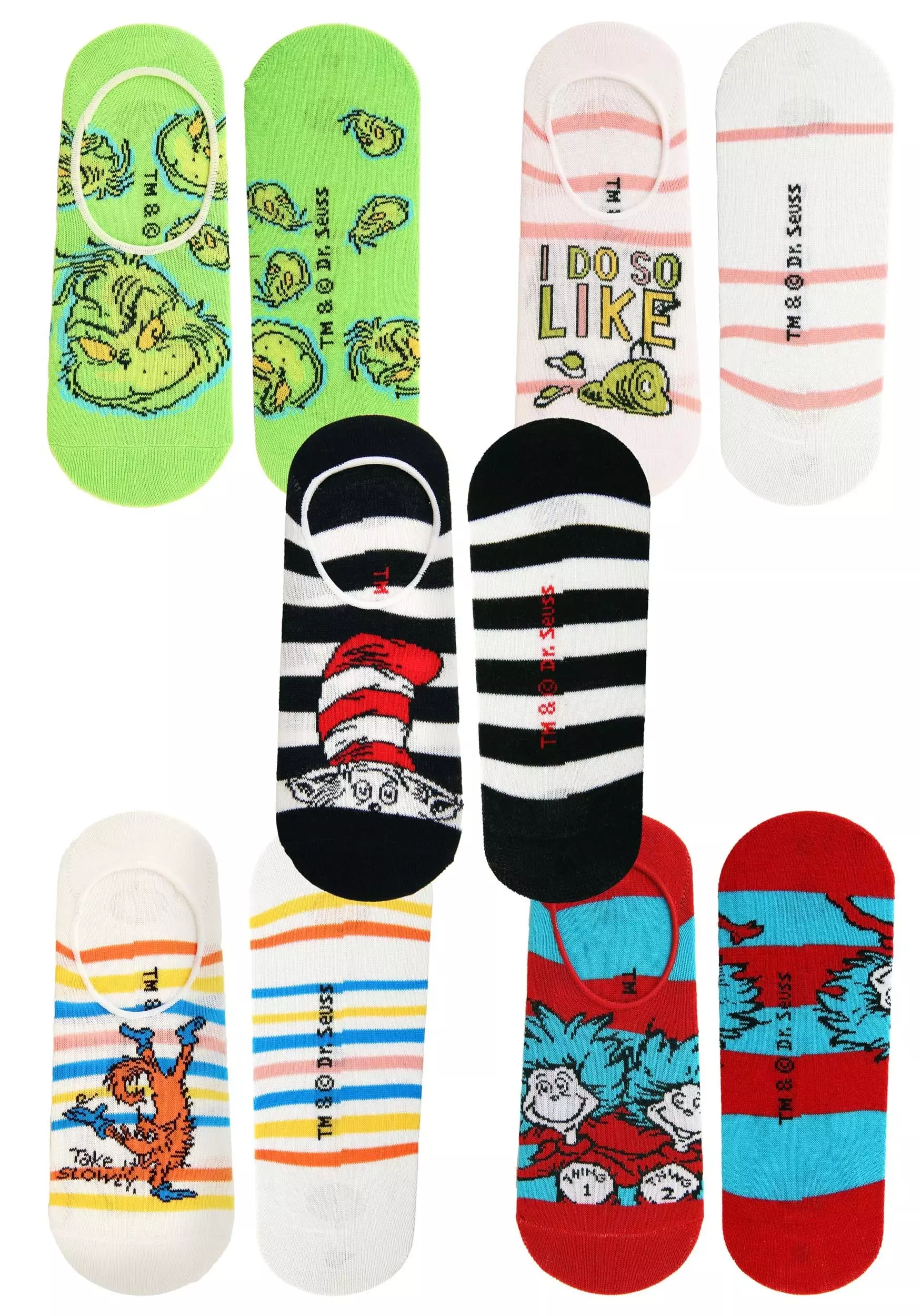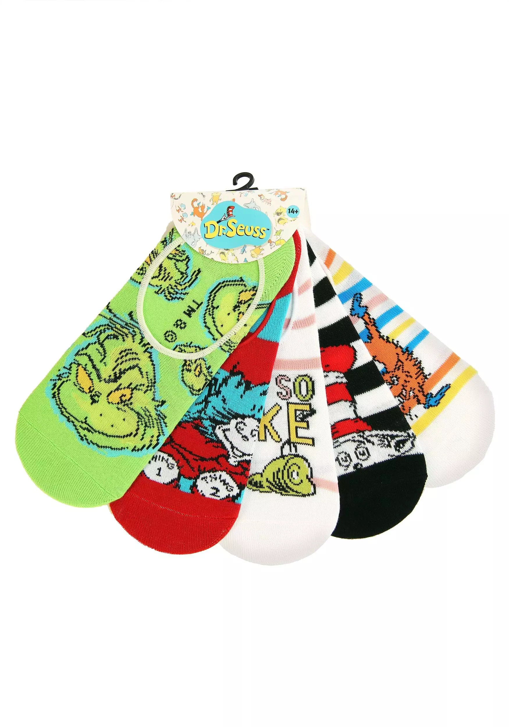 Reclaim your favorite childhood stories with this officially licensed Adult Dr. Seuss No Show Sock 5-Pair Set! Each pair is printed with colorful patterns and graphics from some of Dr. Seuss’s most iconic stories, including the Grinch, the Cat in the Hat, Green Eggs and Ham, and more.
