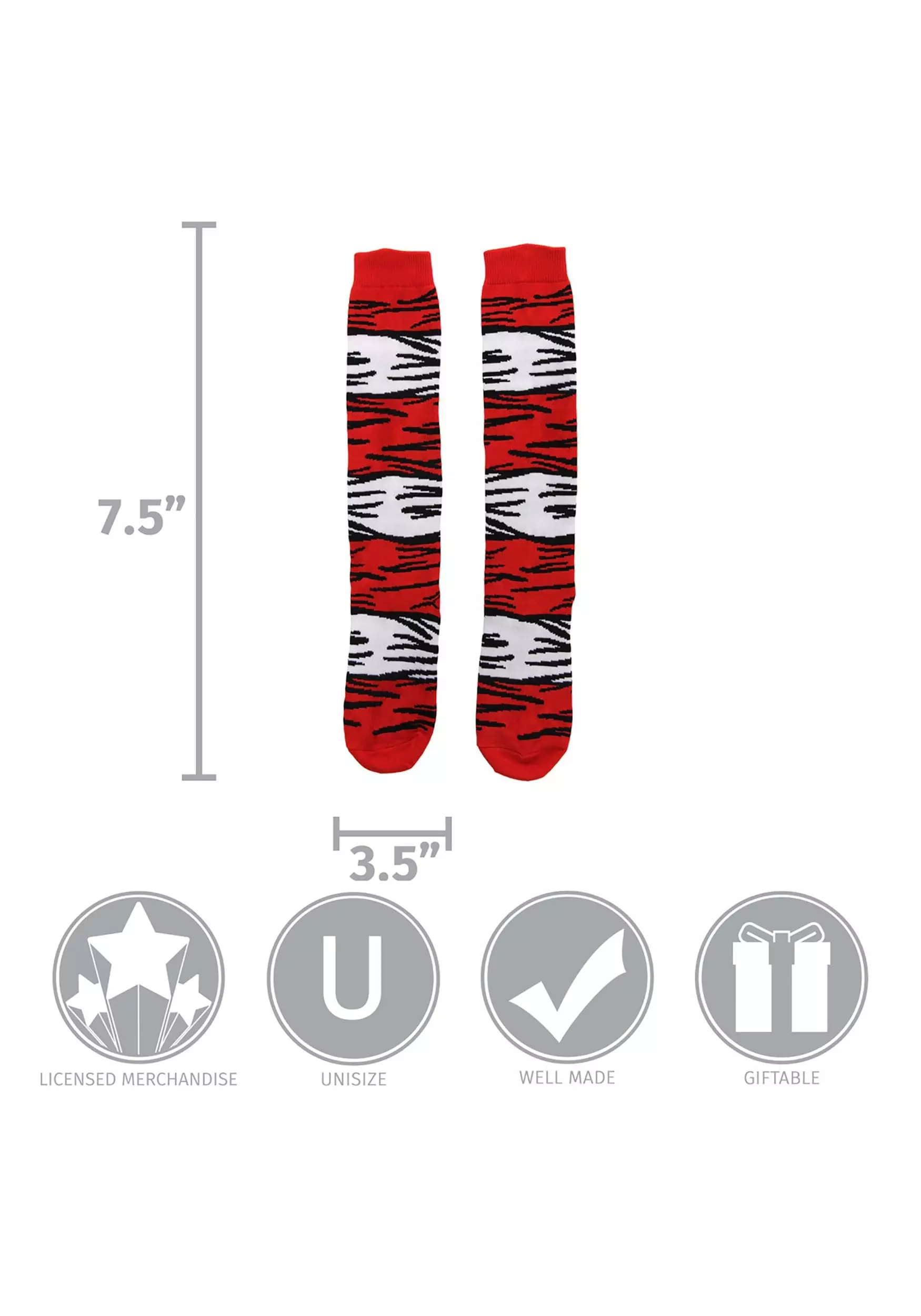 Phew! Dr. Seuss made all that rhyming seem easy. In any case, this delightful pair of officially licensed socks is 20” long, and made of 60% acrylic, 25% nylon, 13% polyester, 1% spandex, and 1% other fiber. The socks are knitted in with red and white stripes, along with black linework that effectively turns the wearer into a Dr. Seuss drawing! Will they allow you to start speaking in rhyme? We can’t guarantee that, but we can’t entirely rule it out either. What we can guarantee is that these socks will wonderfully complement your Cat in the Hat costume!