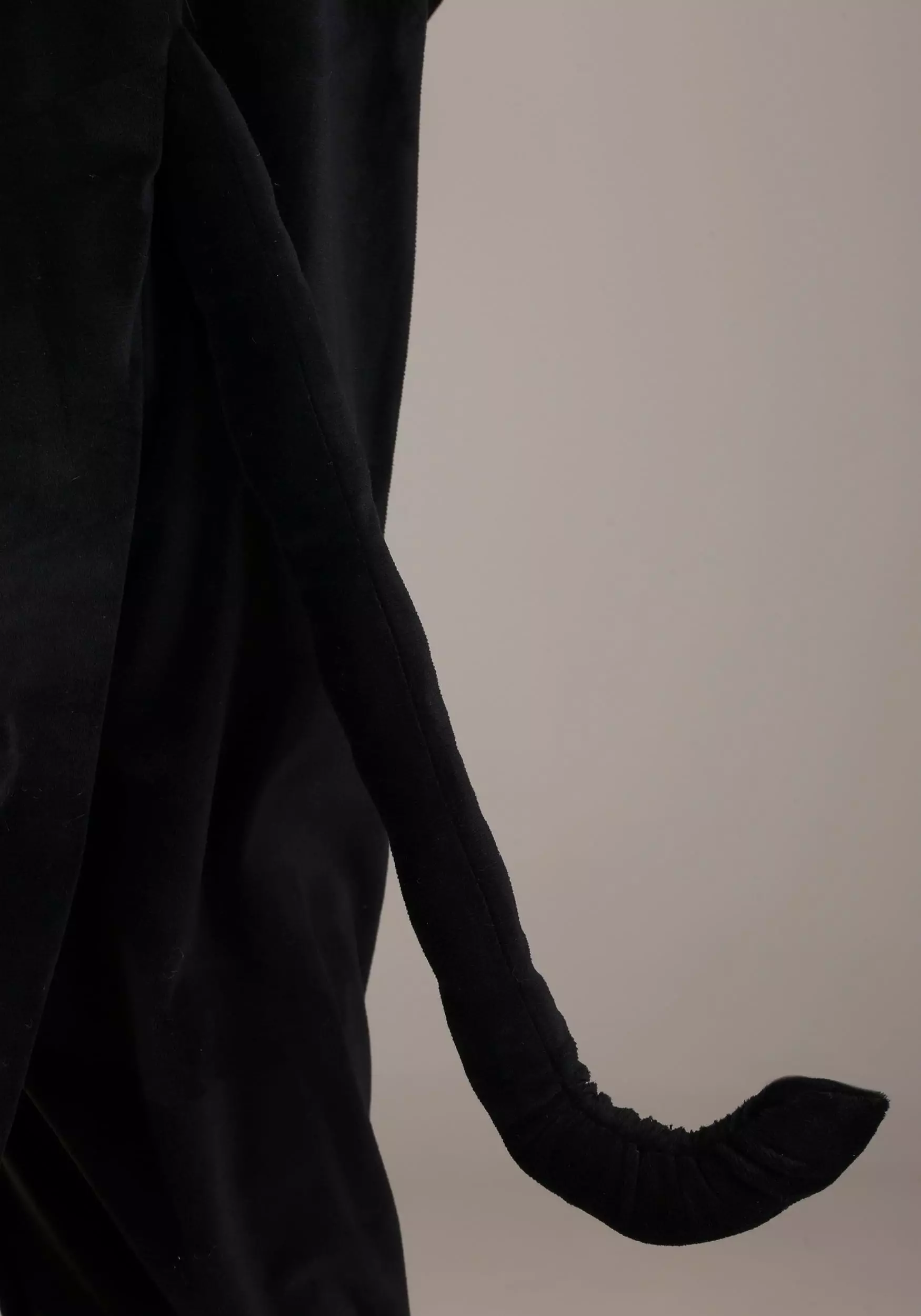 - Velour jumpsuit has faux fur belly inset, foam-backed bow tie at front neck
