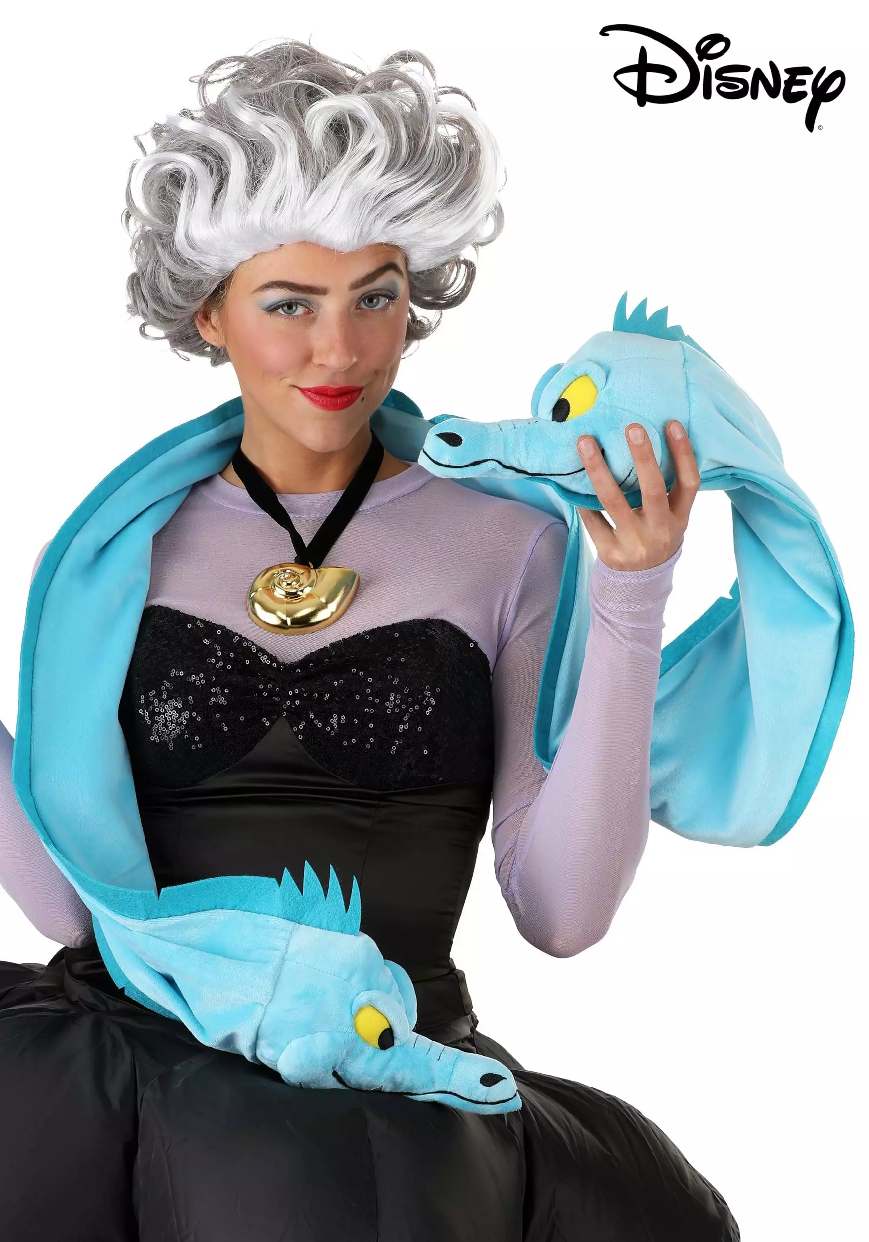 Bring home the ultimate in underwater allies when you put this officially licensed Flotsam and Jetsam Scarf from Disney’s The Little Mermaid around your neck. This in-house design is a vivid blue velour tube scarf that ends in stuffed eel heads. Each head is designed to look like the yellow-eyed and spikey-finned friend of Ursula, the Sea Witch. Measuring in at 74″ long, the scarf ends in small finger loops under each of the character heads so you can direct where they look as you swim around your surroundings!Â