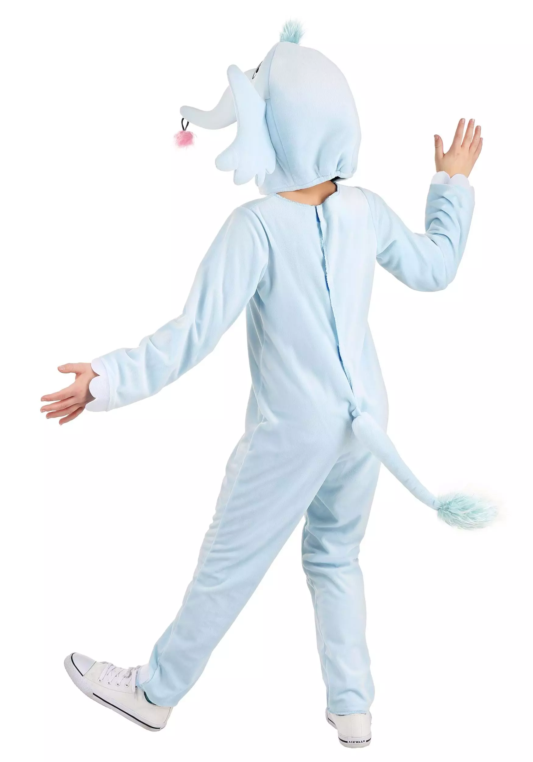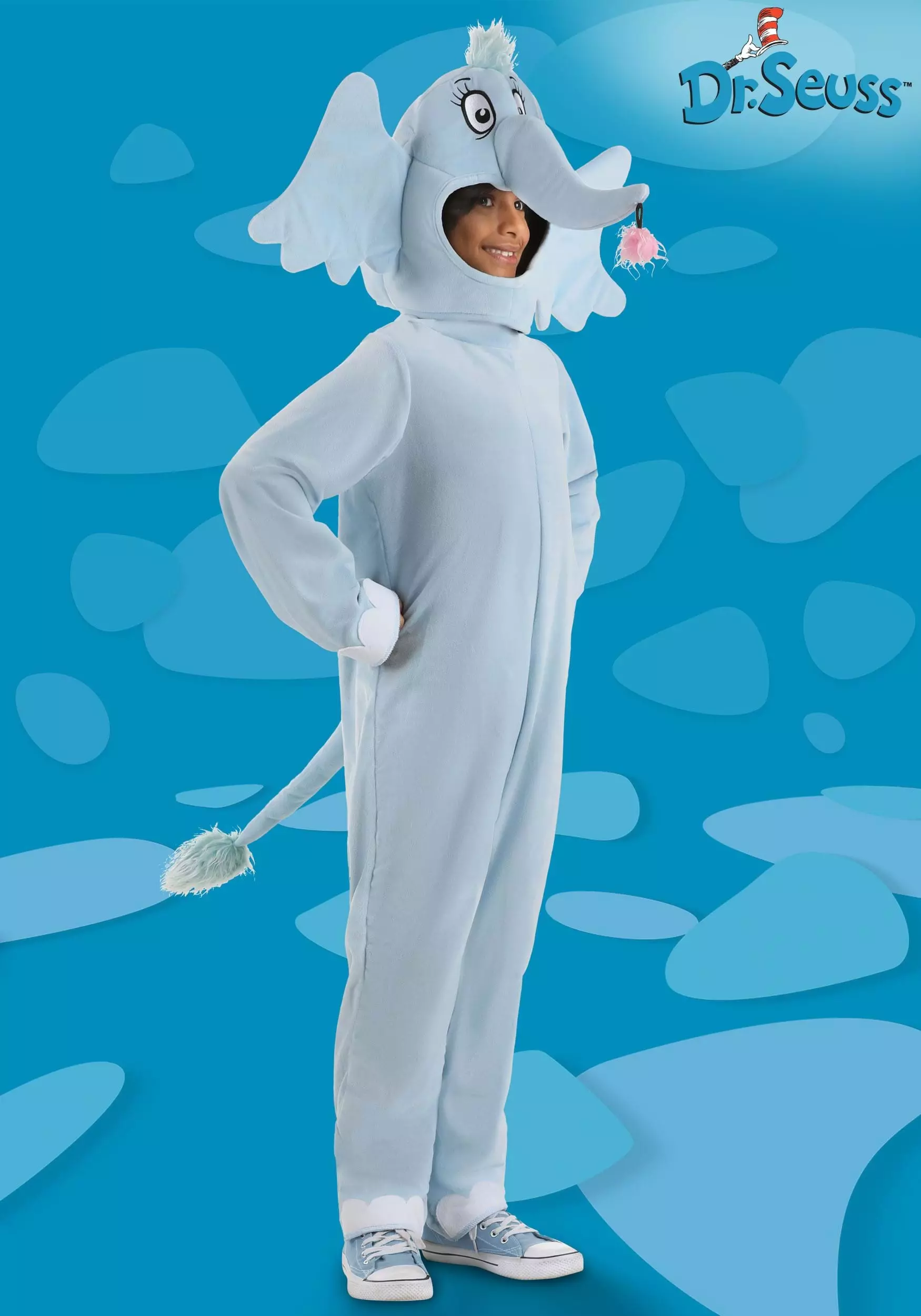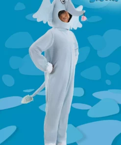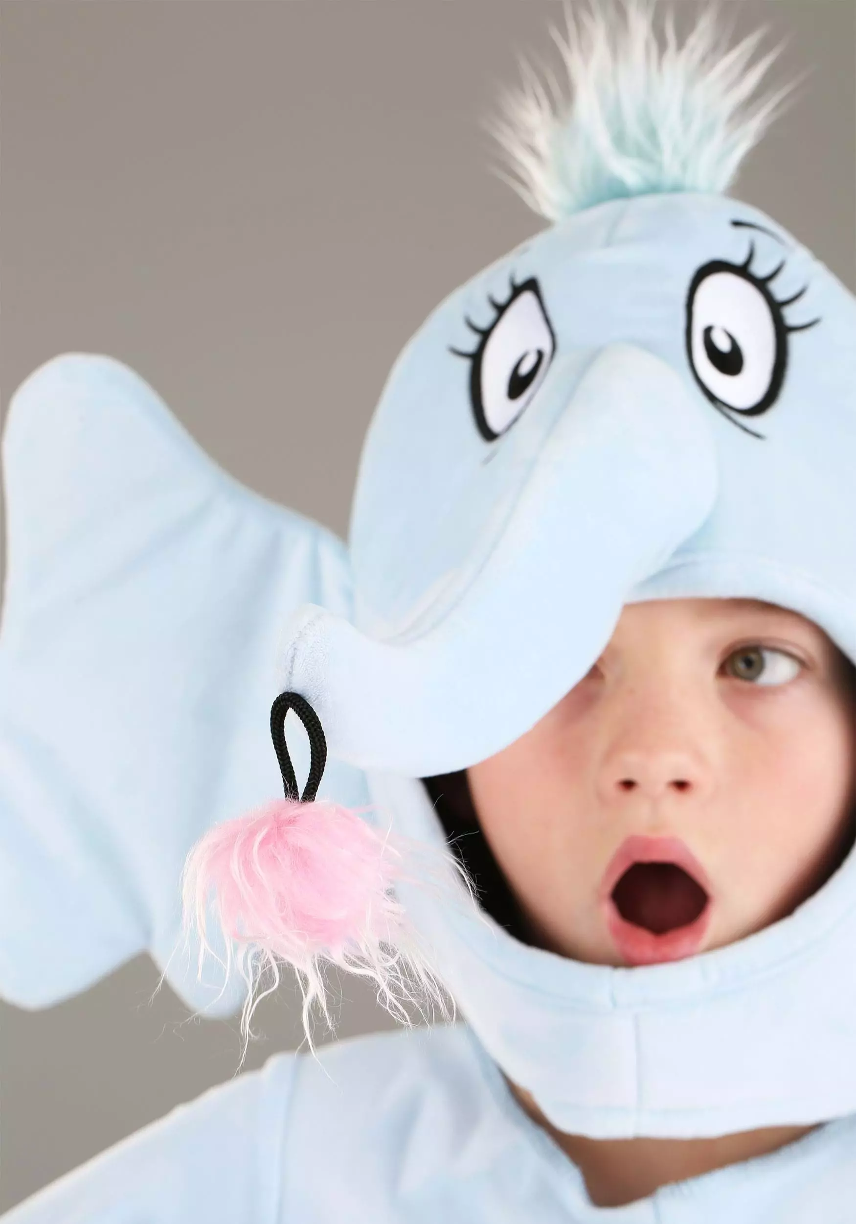 This Dr. Seuss Horton Costume is inspired by the iconic storybook, Horton Hears a Who! The costume starts with a grey jumpsuit that has little felt toes attached to the sleeves. The legs have matching white toes attached to the bottoms and the back even has a tail attached to the waist. The headpiece is shaped like Horton’s head, including the large elephant ears on each side, and a stuffed trunk in front. The trunk even has a small pink tuft attached to it to recreate the little flower that Horton discovered Whoville on. The headpiece has a generous opening for your child’s head, so they can transform into Horton with ease! It’s a great way for anyone to celebrate their favorite Dr. Seuss story!