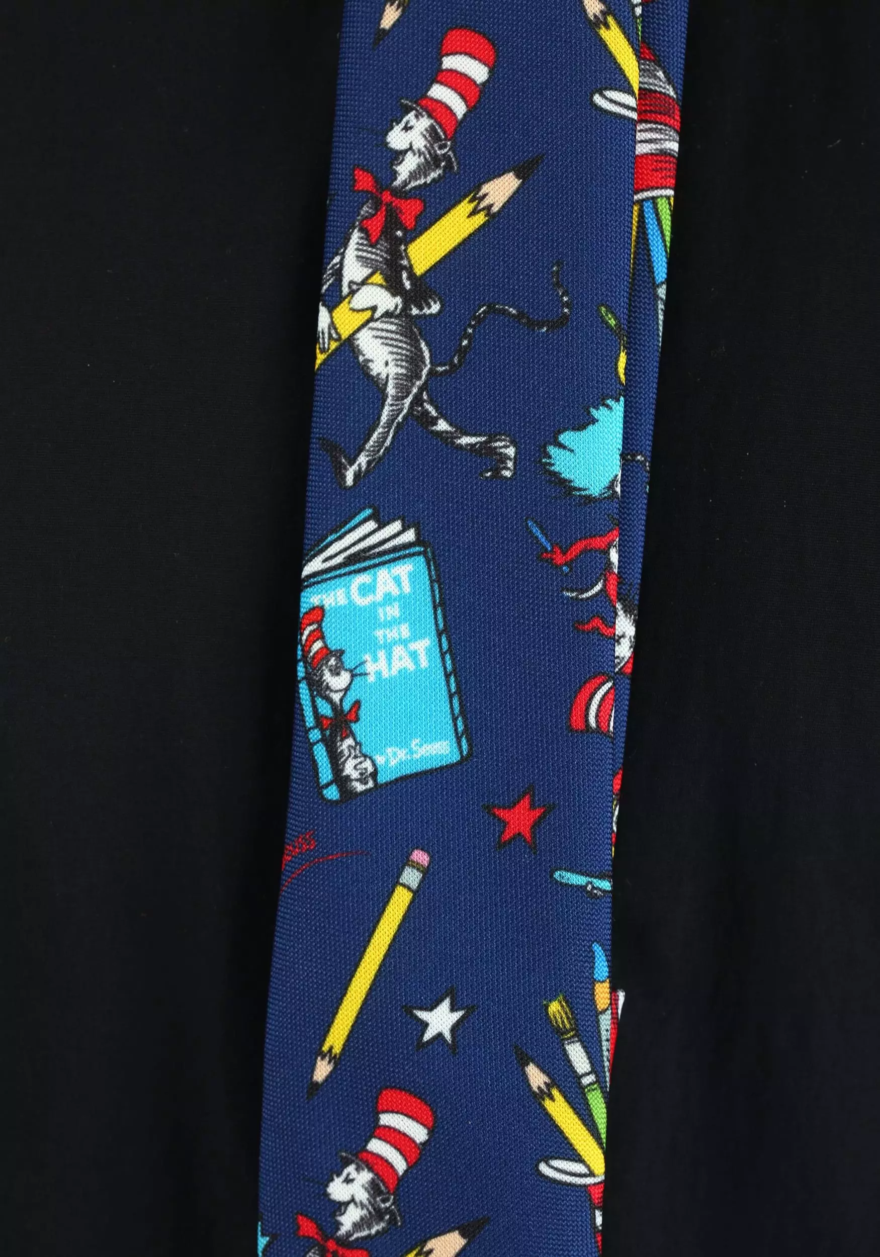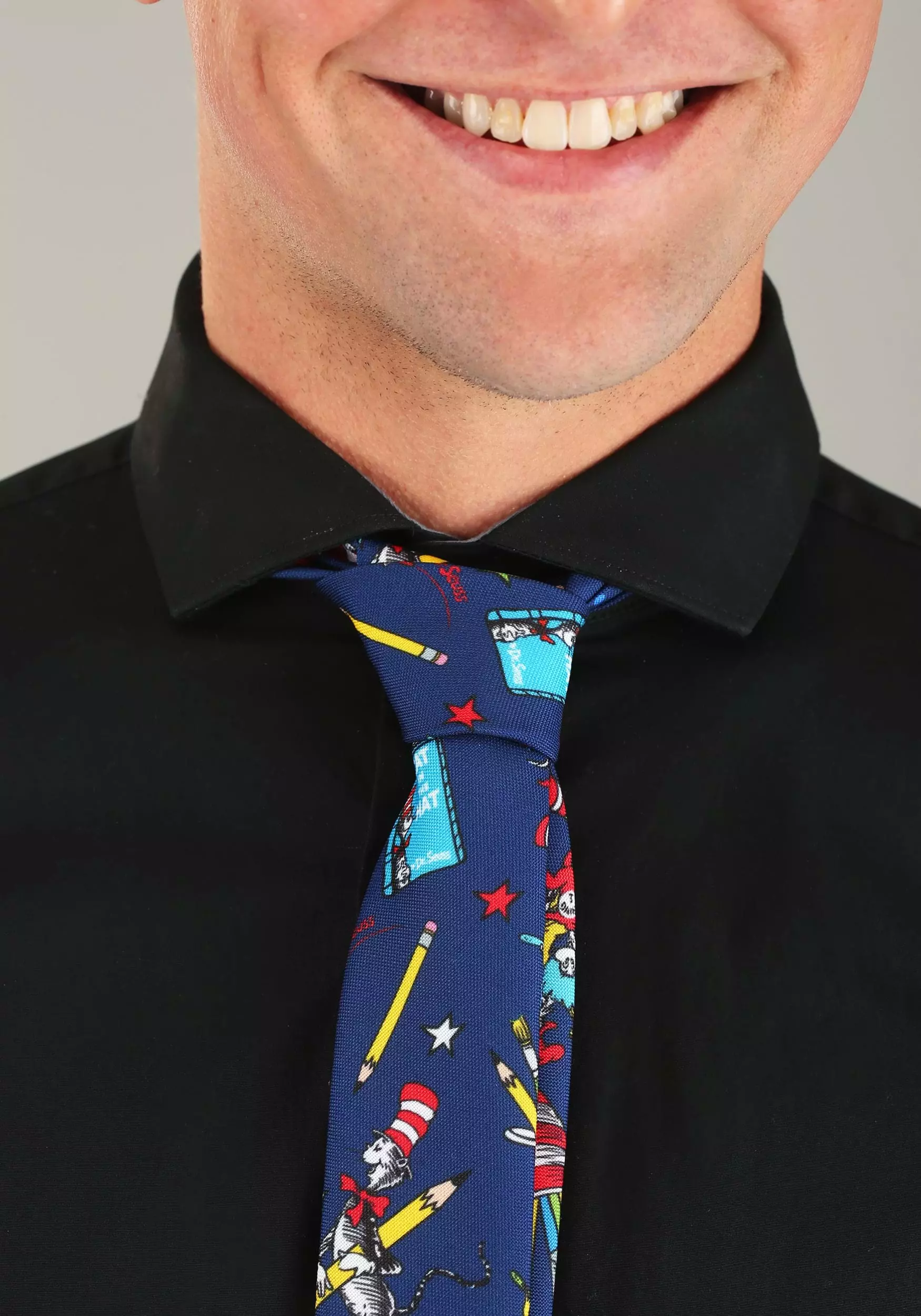 Have you ever seen a cat wearing a hat? Most cats are pretty finicky and probably wouldn’t even let you get a hat near their head. The only cat we’ve seen that adores wearing a hat, is the one and only Cat in the Hat from Dr. Seuss’s classic storybook! He’s perhaps our favorite book character of all time… and we wanted to bring him into everyday fashion. That’s why we love this Dr. Seuss Reading Pattern Necktie from Elope. It’s a simple way to bring cats, hats, and a healthy love of reading into any outfit.