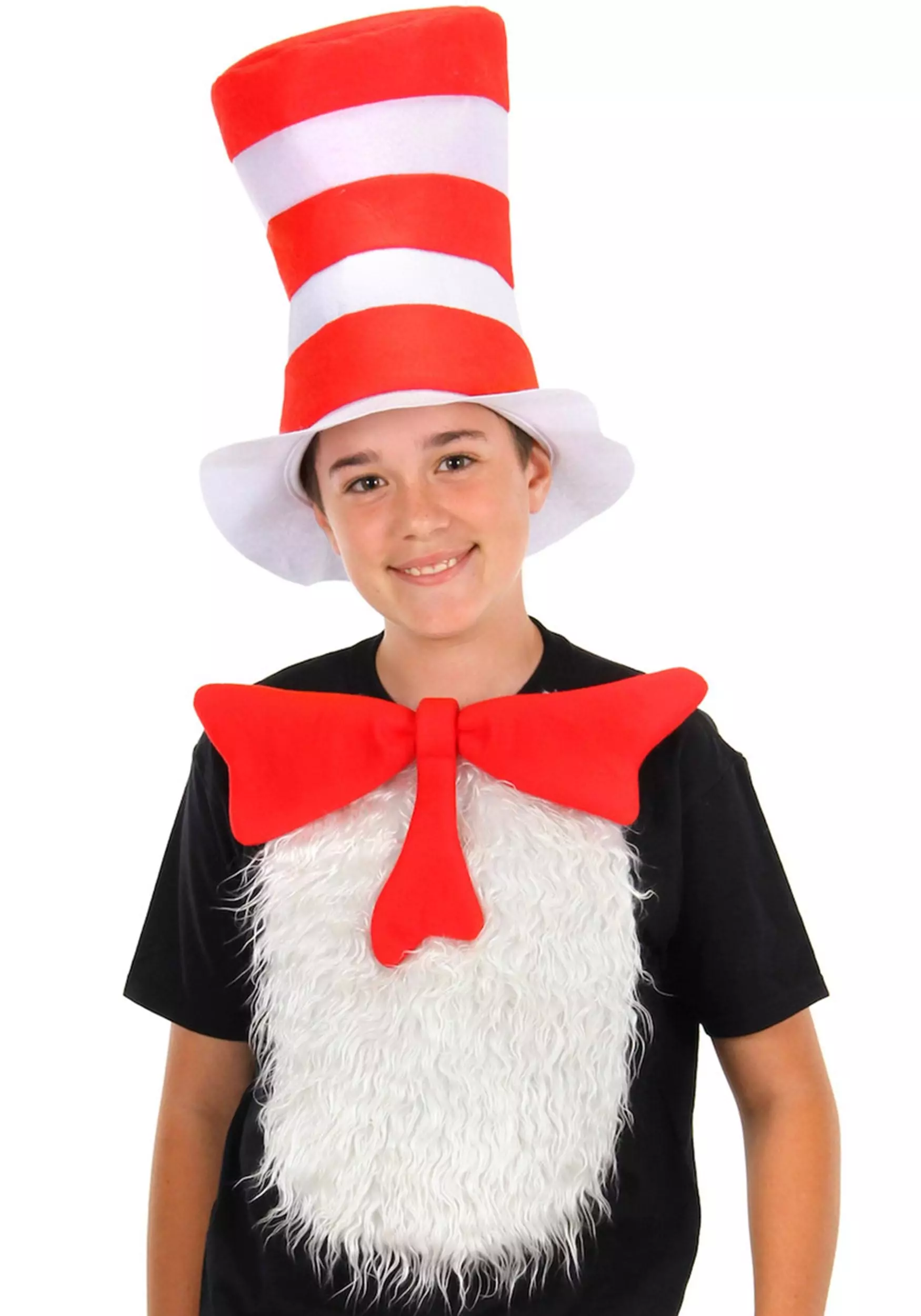 Rain or shine, you’ll never be bored when you wear this officially licensed Dr. Seuss The Cat in the Hat Deluxe Accessory Kit! The felt top hat is patterned with cheerful red and white stripes up and down its high crown. An oversized red bow tie adorns the patch of white faux fur. Fasten the fur to the front of a black shirt, wear it with a pair of black pants, and you’ll have an easy and delightful costume all ready to go.Â