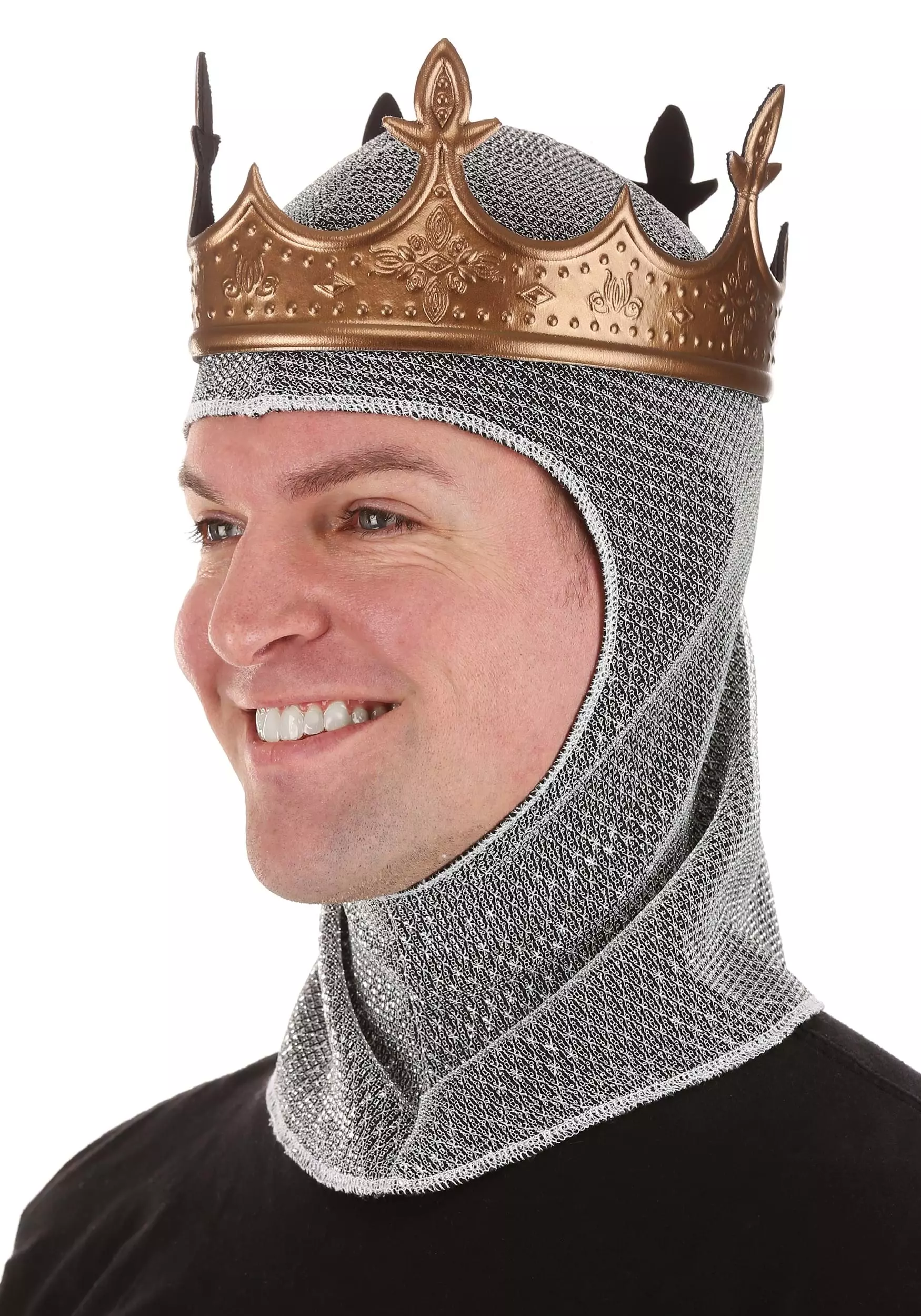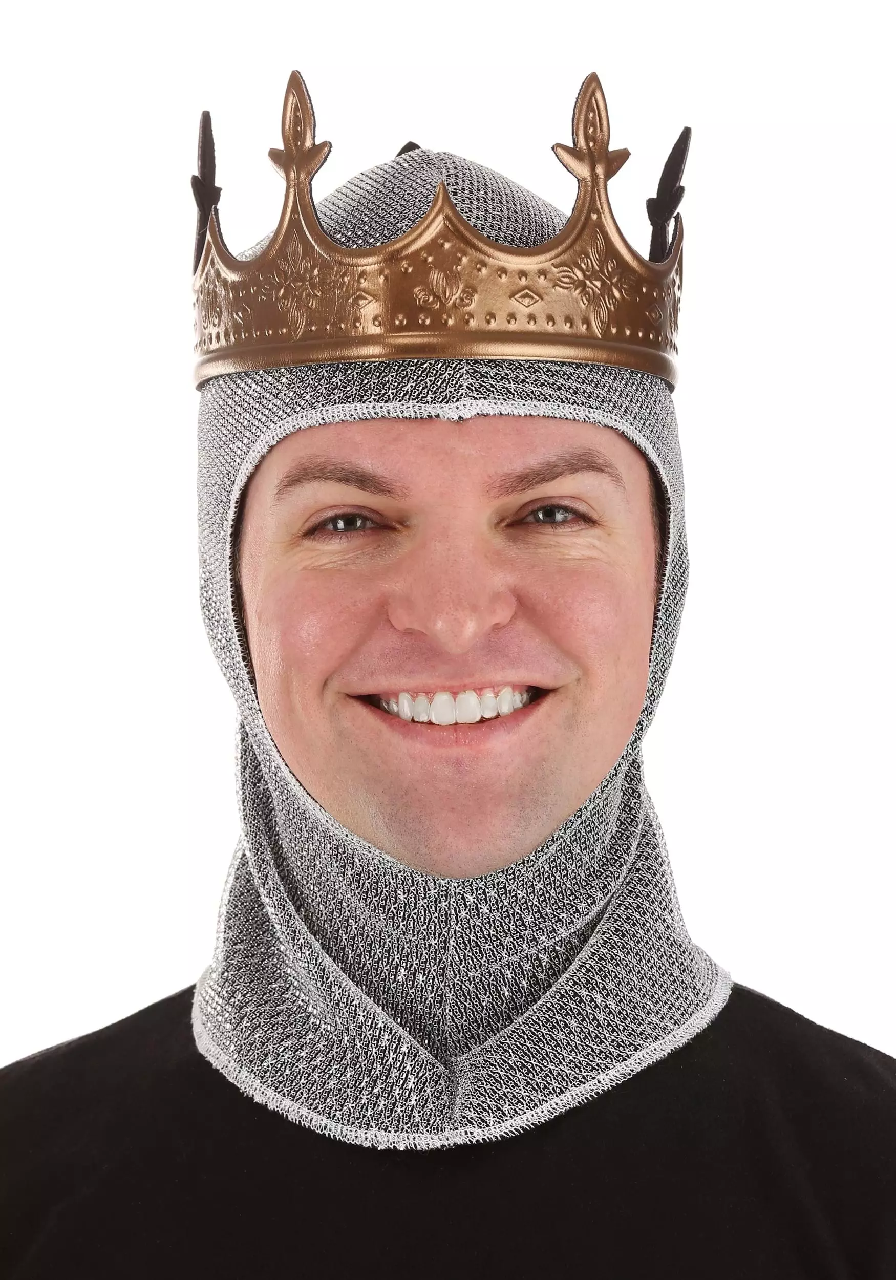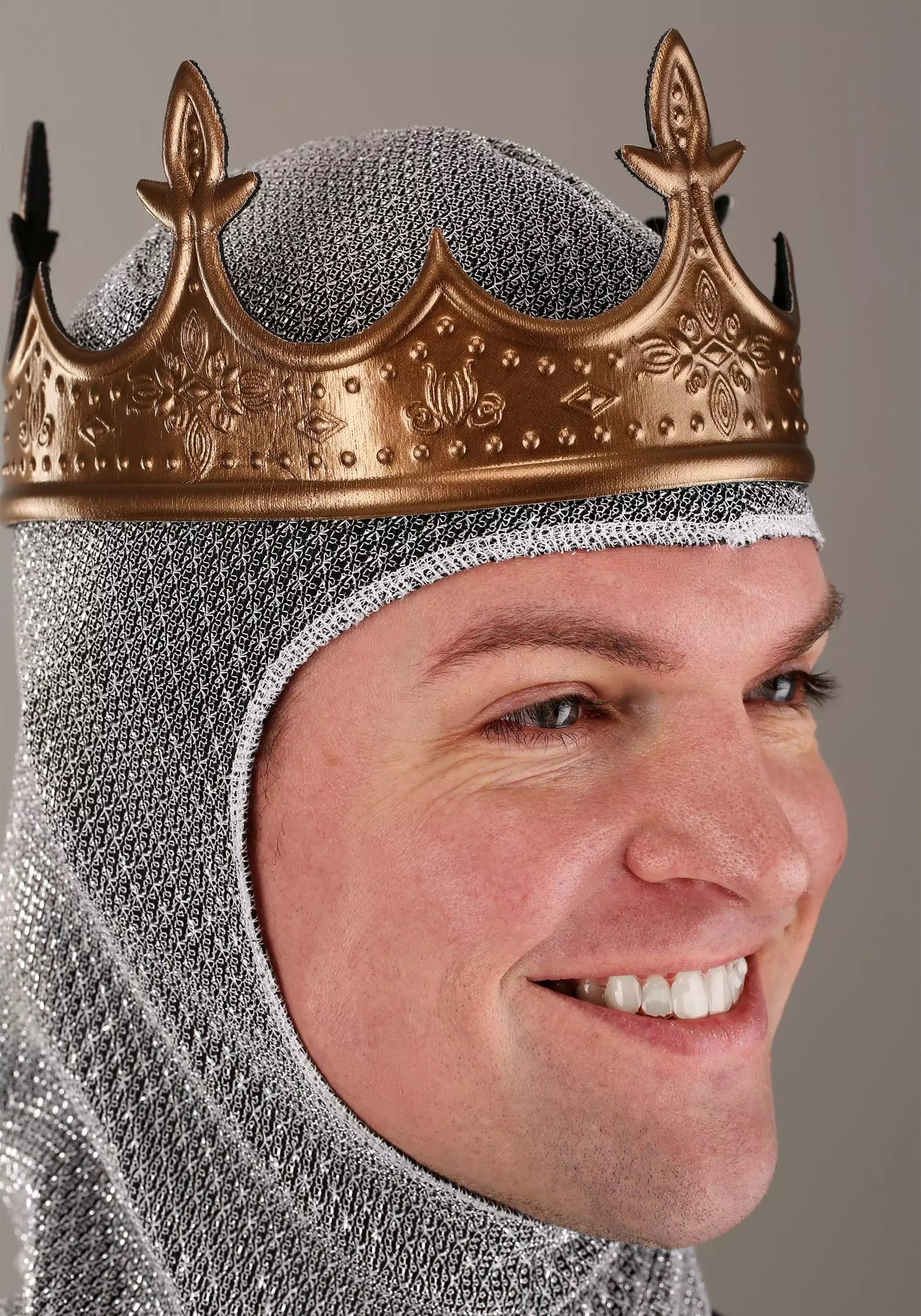 All of England will rejoice at your triumphant homecoming when you wear your King Arthur Crown with Hood! A shiny golden crown encircles your noble brow (it may appear to be made of plastic, but we assure you that it’s the real deal). It tops a hood of cloth stitched to resemble chain mail – impressive, but much more comfortable than the fully metal version.Â