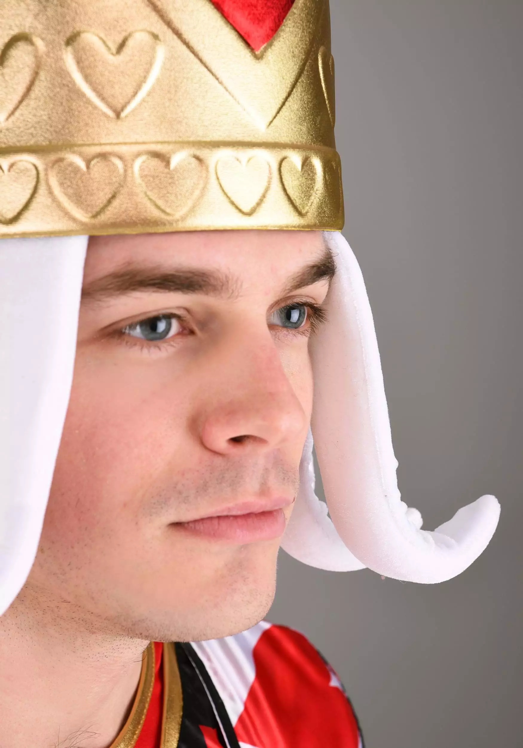 This classy crown will make it clear that you’re the King of Hearts. The crown creates heart silhouettes with shiny red hearts for accents. Heart shapes are stamped throughout for extra detail. Curls of plush white curls to create kingly hair completes this royal look. Those who want to rock their own do can peel the plush hair off the crown with a strip of hook and loop fastener. Complete your look with any of our King of Hearts costume to make yourself look right at home on a throne in your kingdom of cards!