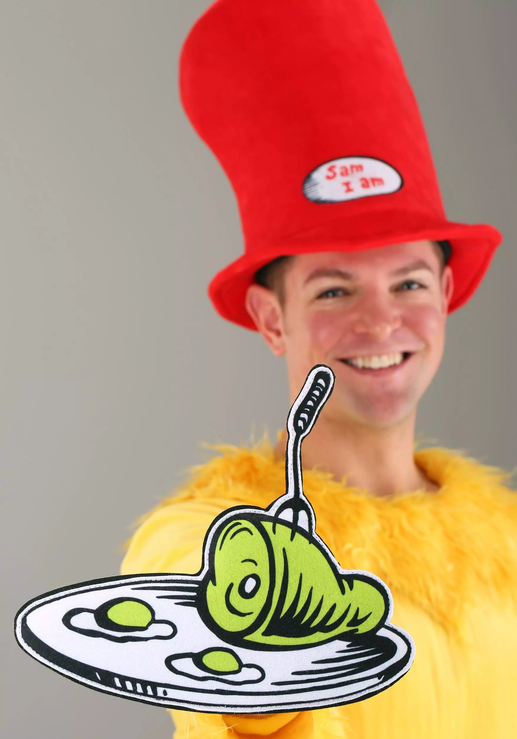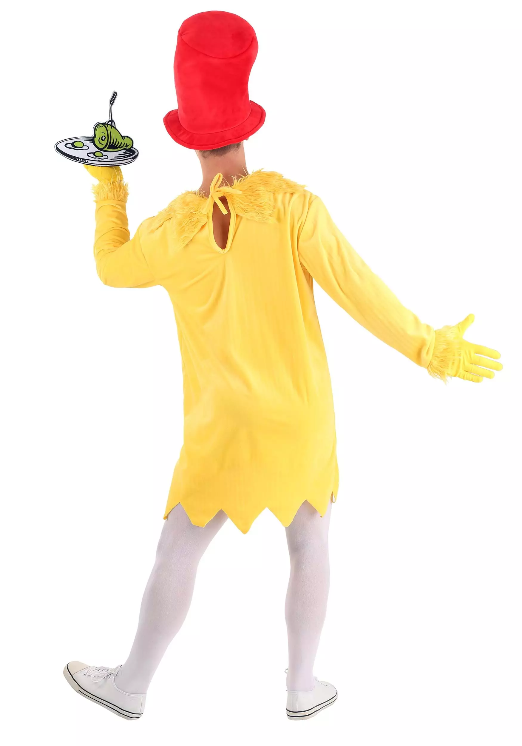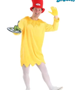 This licensed Dr. Seuss costume is ready to bring some serious green eggs and ham fun to life! The costume includes a long yellow tunic that fastens with a tie at the back. The collar is shaggy with faux fur that also trims the cuffs of the sleeves. You’ll also get a 2-D plate of green eggs and ham that you can offer to those around you. Topped off with a red top hat that labels you as Sam I Am. A great costume for school events like Read Across America and family-friendly Halloween parties.Â
