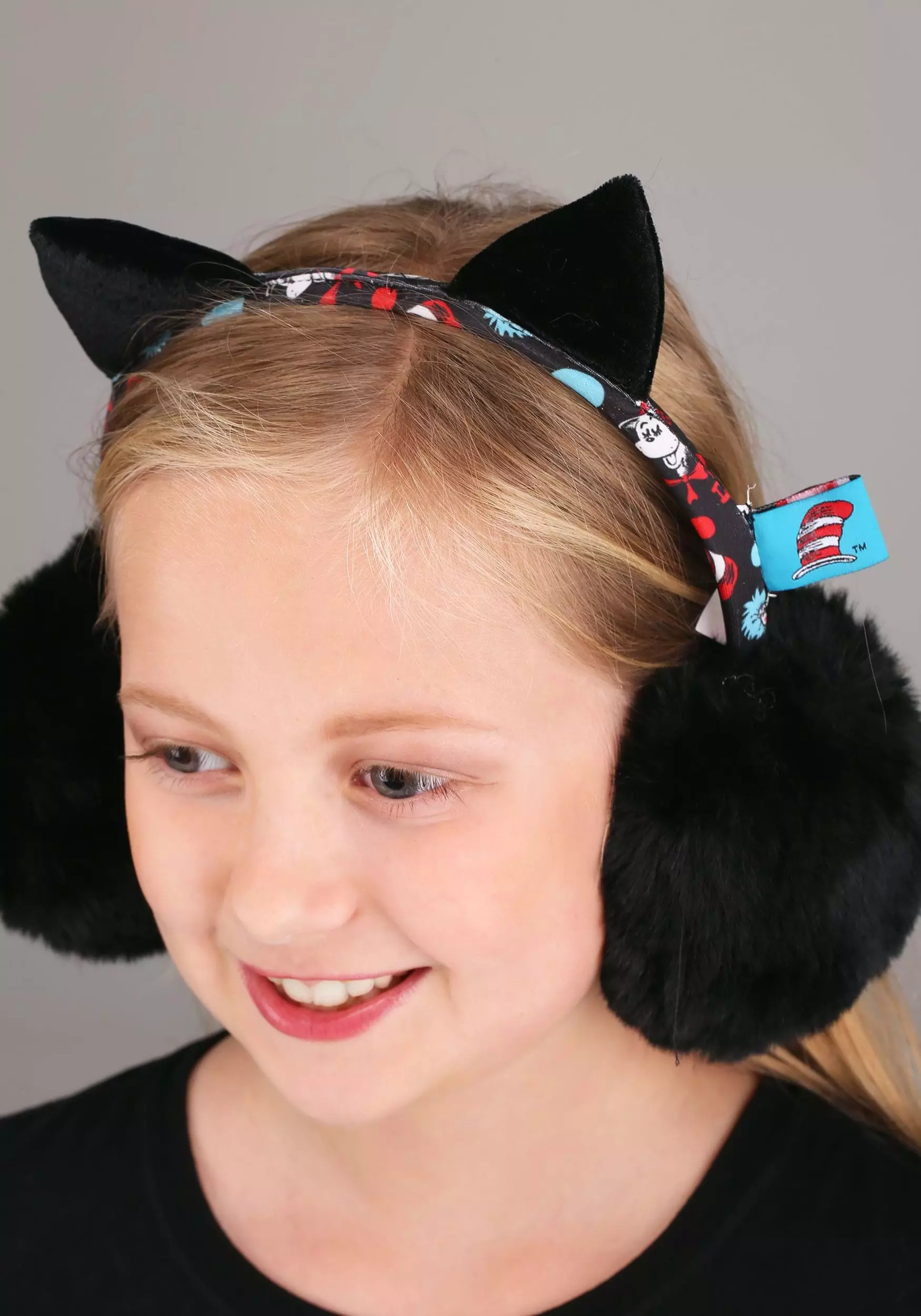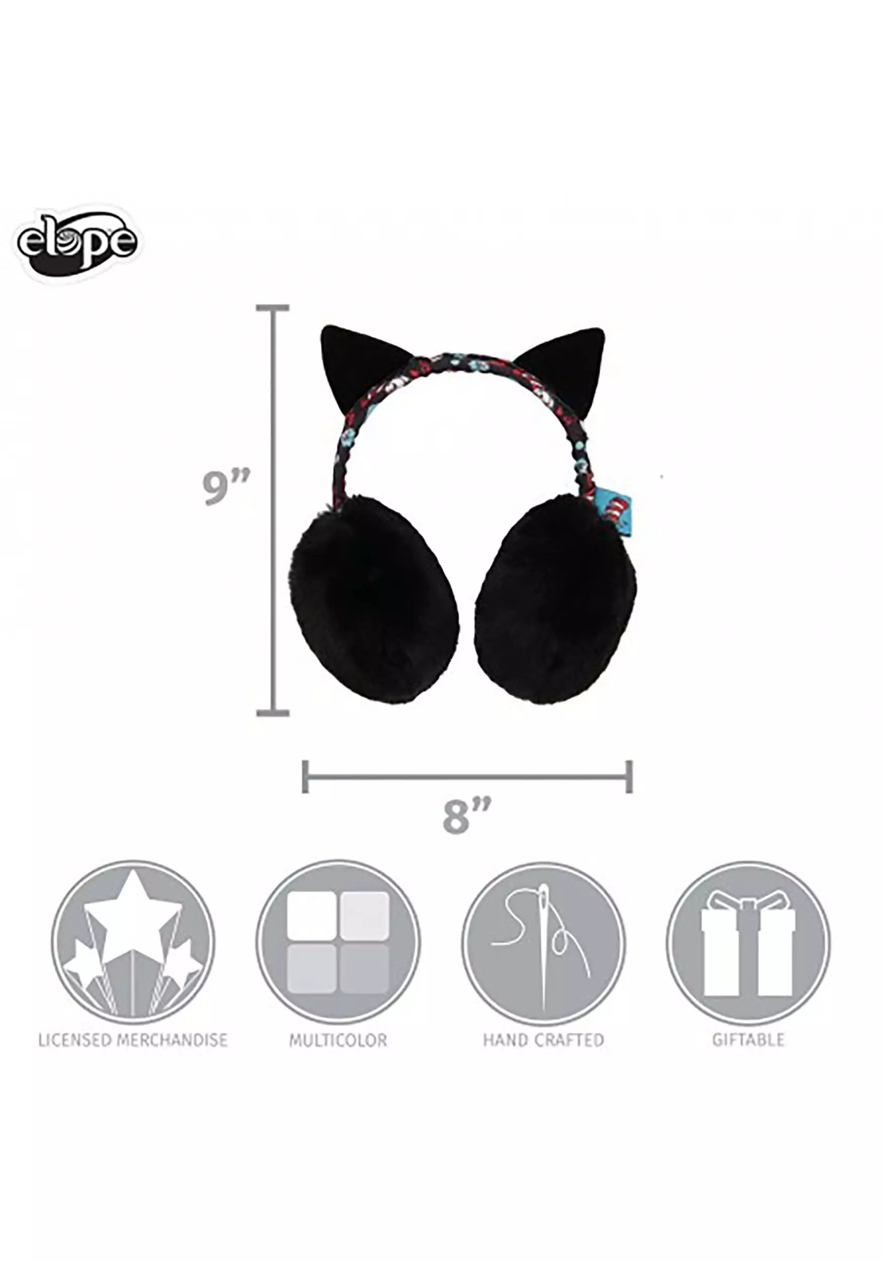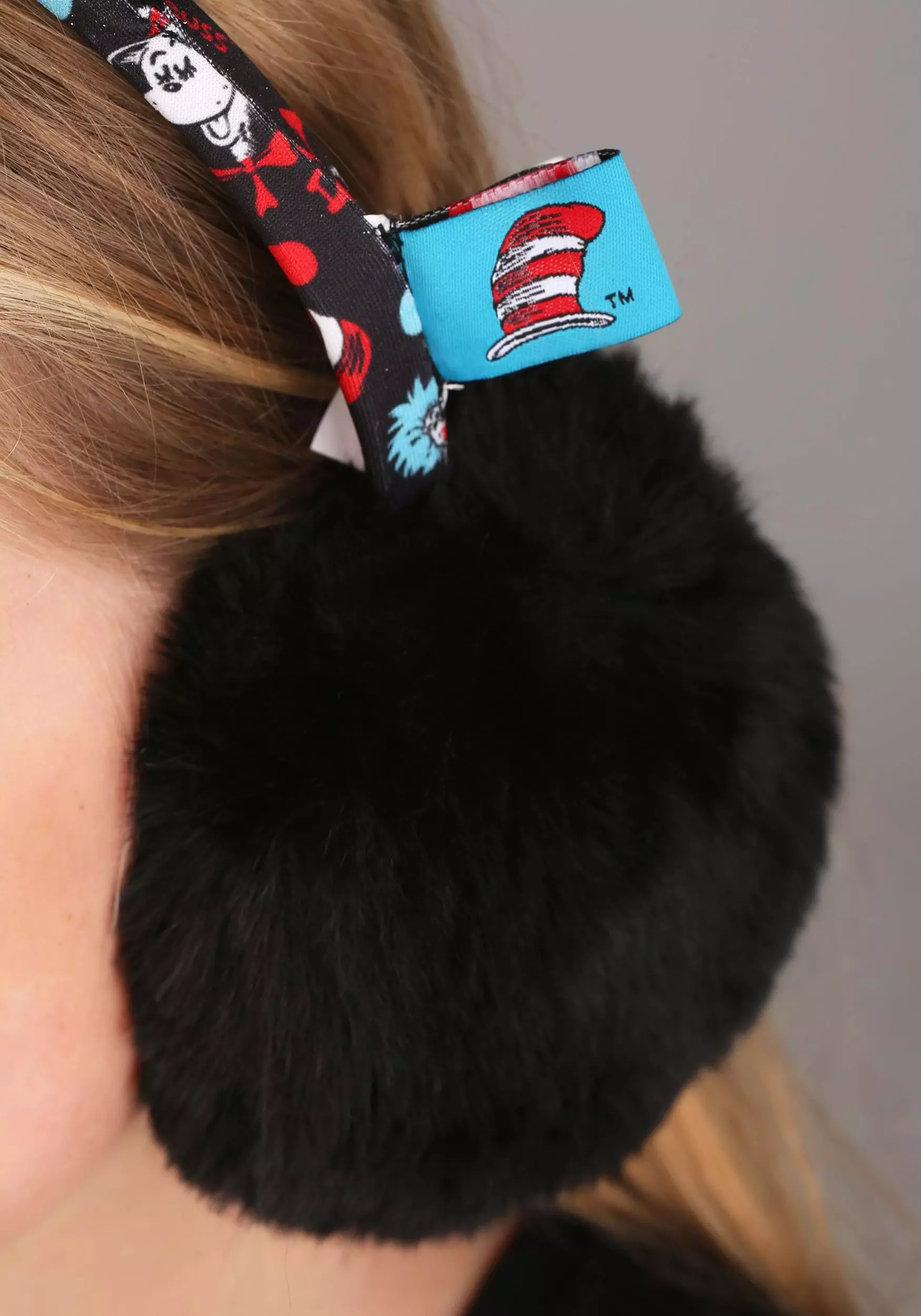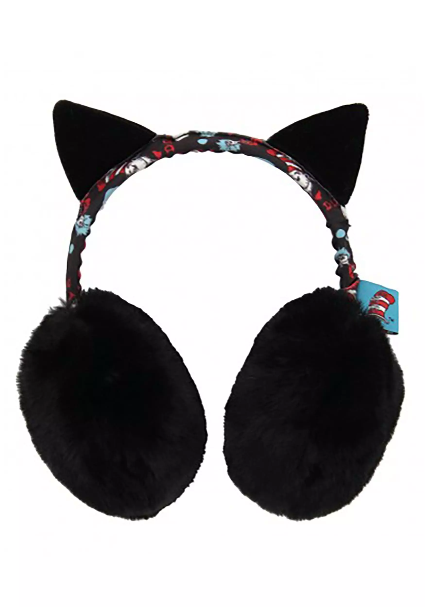 Give your wardrobe a Dr. Seuss-style makeover with these exclusive, officially licensed The Cat in the Hat Adjustable Earmuffs! The ear muffs are covered with soft fabric that features a repeating print of the Cat in the Hat and the two Things. The muffs are made of black faux fur, and two black fabric cat ears are attached to the top of the band.Â