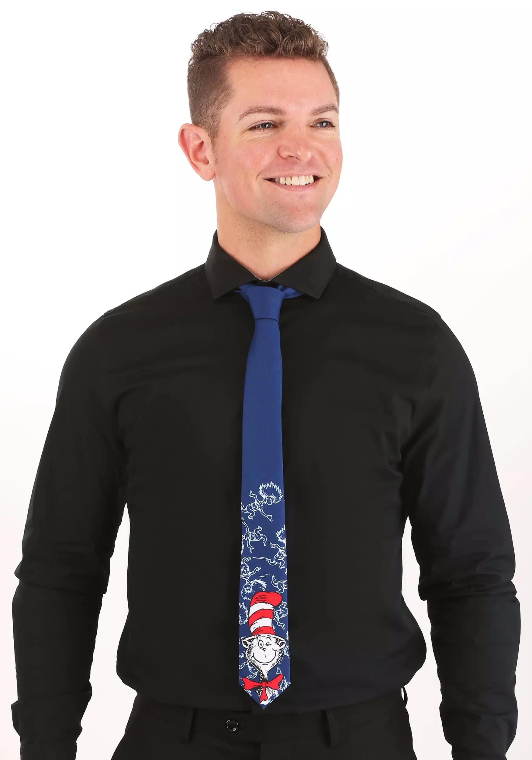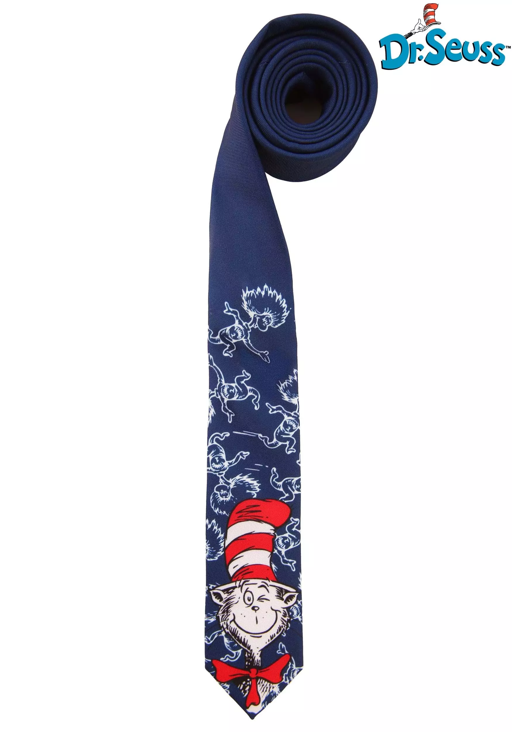 Celebrate Seuss with a touch of class! The Cat in the Hat Character Necktie comes officially licensed from the masterpiece book by Dr. Seuss and has all-over printed graphics featuring the Cat in the Hat, and Thing 1 and Thing 2. The tie is made out of a simple poplin fabric and measures 60 inches long. It’s a tie-it-yourself kind of tie, so make sure your Windsor knot game is on point! You can pair it with any dress shirt or wear it for Read Across America!