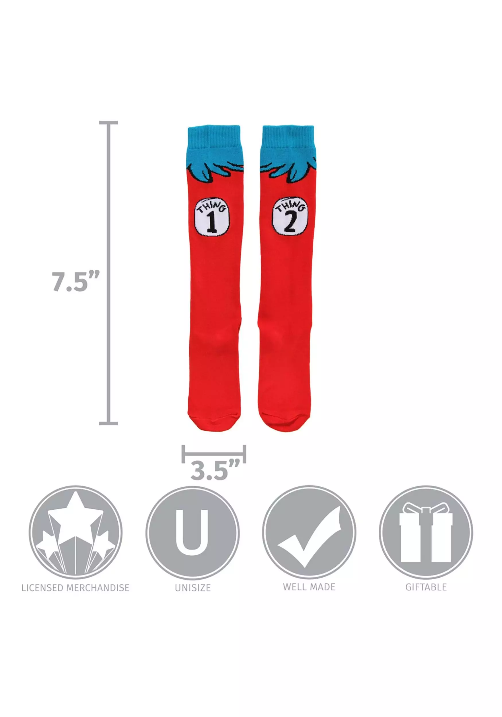 This pair of officially licensed socks is made of 74% acrylic, 13% polyester, 11% nylon, 1% spandex, and 1% other fibers, and is perfect for recreating the whimsical whirlwind that is Thing 1 and Thing 2, with knitted-in graphics featuring their respective Thing number, and their distinctive blue hair. At 21″ long, these socks are roughly the same size as the little mischief-makers from the book! Consider pairing one of our Cat in the Hat costumes with these socks, and you’ll be wearing a costume for three different characters; quite the feat! No pun intended.