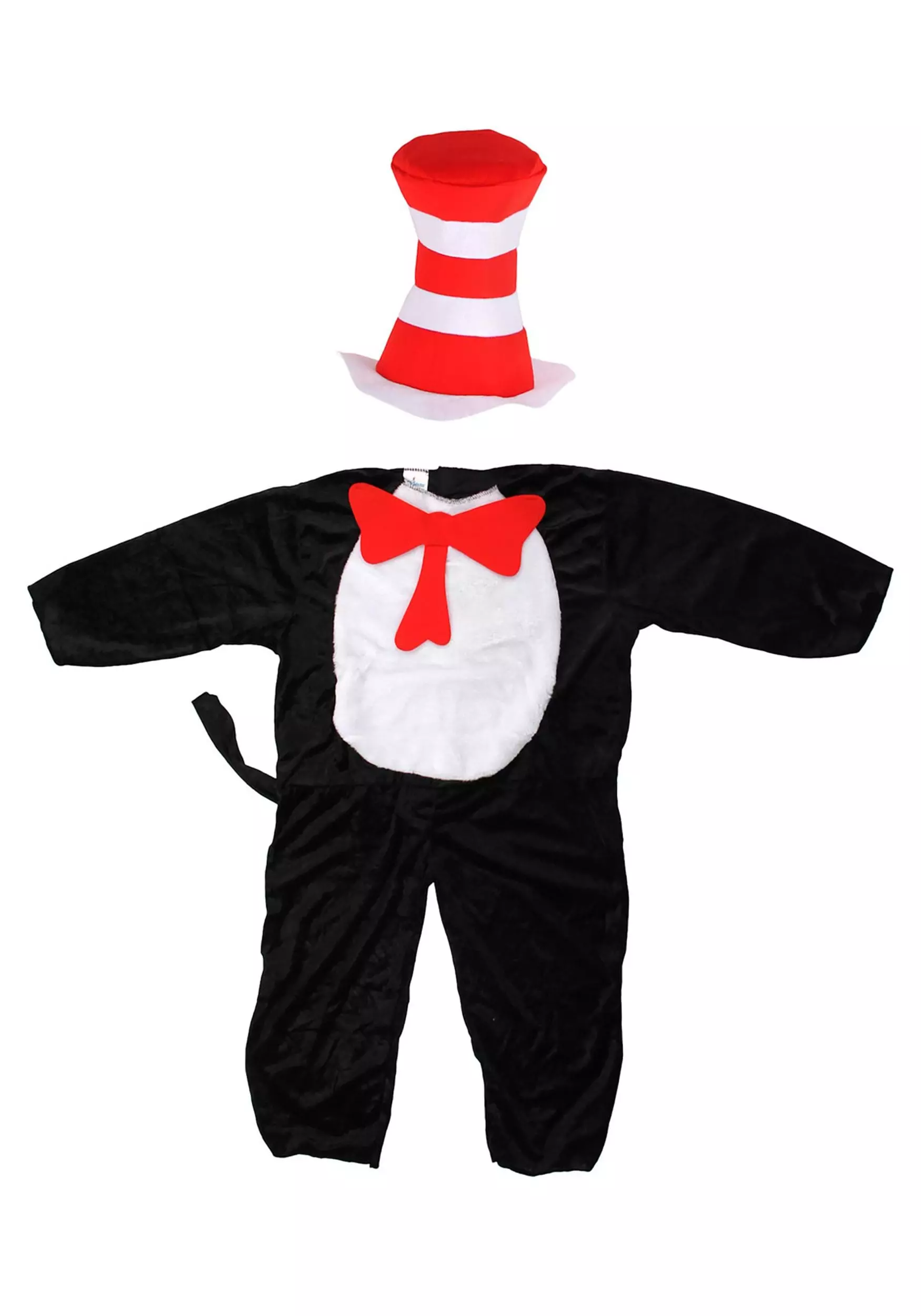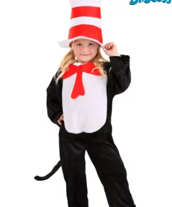 Ted Giesel would definitely approve of this playful outfit! Your little sweetie will bring giggles and whimsy everywhere she goes in this Toddler The Cat in the Hat Costume! The snuggly black and white cat jumpsuit is made of super-soft polyester for comfortable play. The tail is perfect for whirling and twirling, and it attaches to the jumpsuit’s seat with a hook and loop fastener. An oversized, red felt bow tie attaches jauntily to the jumpsuit’s neck. Of course, what is Dr. Seuss’s famous Cat without his Hat? The striped, red and white stovepipe lid fits most heads. Playtime for all! (Except for that buzzkill fish.)