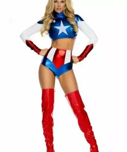 This tough look is the perfect way to power up for all sorts of events. From the Fourth of July to a happy Halloween. The best part is, people are sure to know that you’re not the sort of superhero who goes around smashing cars and flower carts willy-nilly. You’re kind of a hero of small business owners if you think about it! Top this costume off with a pair of superhero boots or even our liberty star leggings. Whatever your costume of choice might be, shine on with this smart superhero costume!