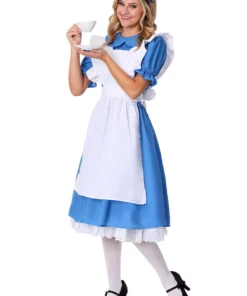 Now you can look exactly like your favorite, though often confused, storybook character when you wear this Adult Deluxe Alice Costume! This is a complete costume that will make you look like you are chasing the white rabbit! This unique and exclusive Alice costume is perfect for Halloween, plays, or even for the start of a cosplay costume. The adult costume includes a blue dress that fastens with buttons in the center of the back. For added detail, the dress has puffed sleeves and a Peter Pan style collar. The white pinafore apron has ruffles around the shoulders and ties at the waist for a comfortable fit. The skirt of the dress has a sewn-in white slip trimmed with eyelet lace ruffles. Also included is a long, black satin hair ribbon that you can tie any way you wish. Pick up a pair of Mary Jane shoes to complete the look! Don’t forget the white tights and clock purse – they will truly set your costume apart from the others! This Halloween is just a rabbit hole away when you choose this affordable and fashionable adult Alice costume!