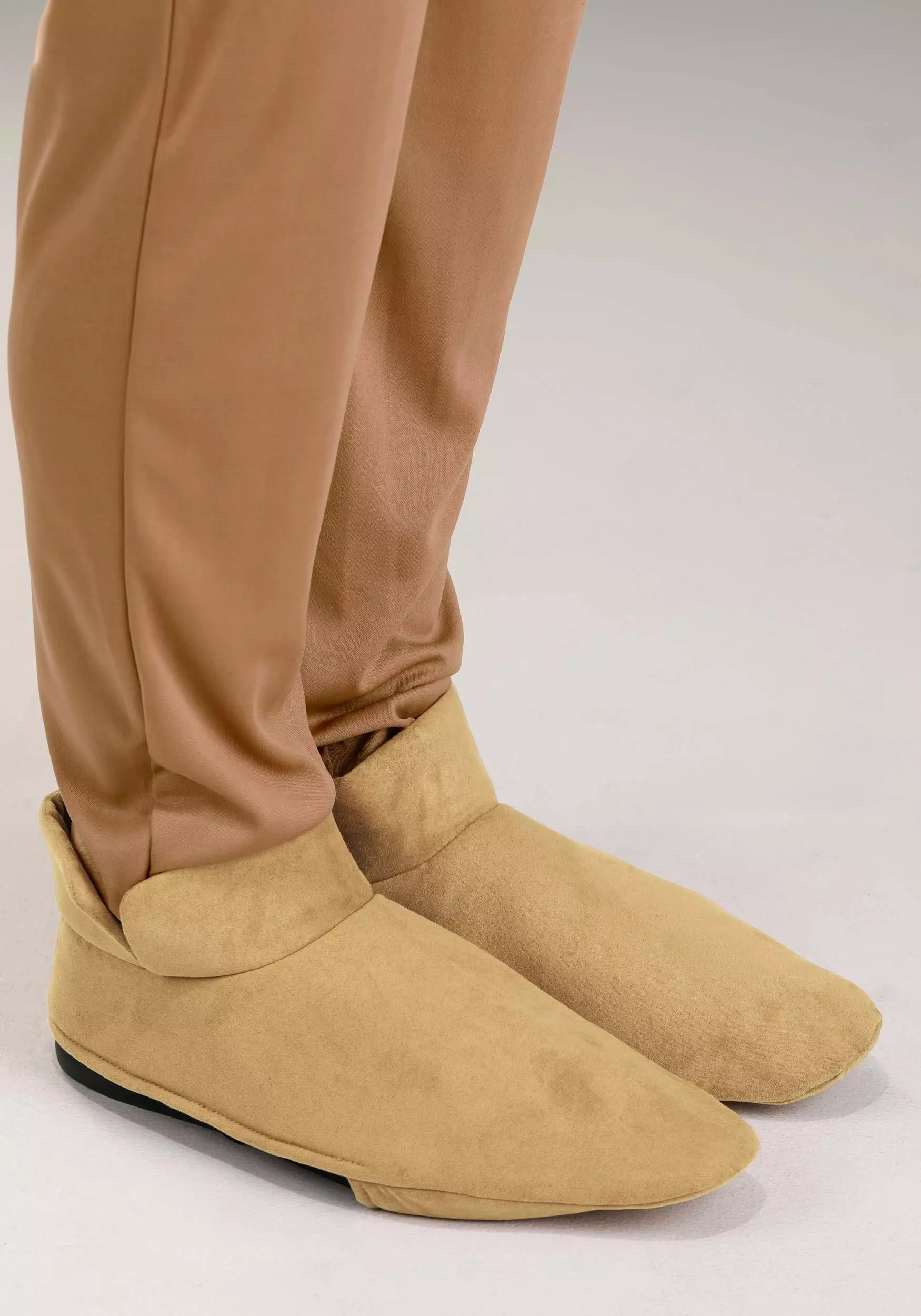 - Pair of faux suede foam foot covers w/ elastic bands to secure under feet