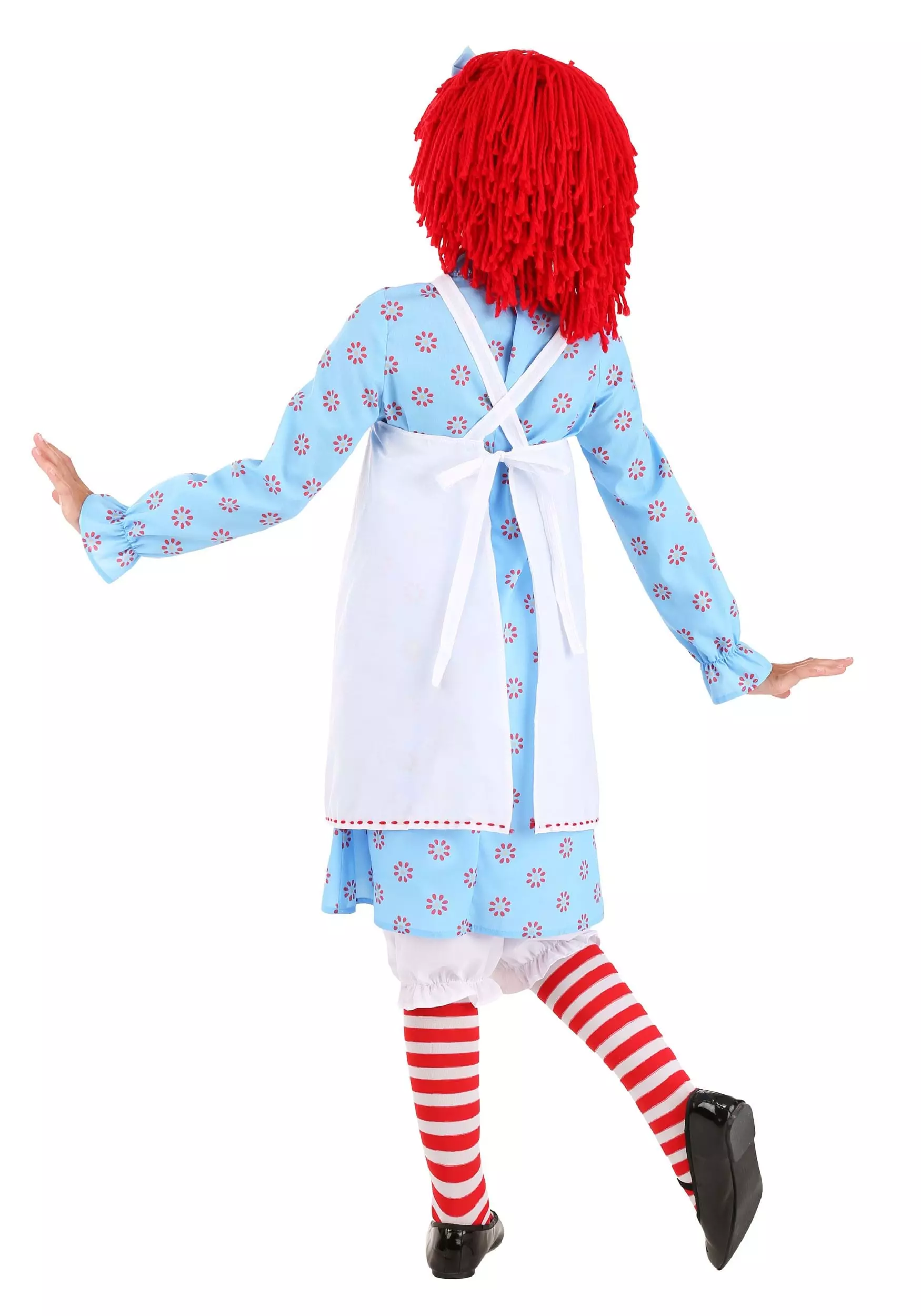 This classic Raggedy Ann doll is fully licensed and designed by our in-house creative team. The look features a cheery blue dress that falls to the knee and has a pinafore-style apron layered over the top. Adorable bloomers peep out from under the knee-length hemline. This colorful rag doll look is completed with red and white striped socks, a hair bow, and the classic Raggedy Ann wig. Playtime is about to come to life like never before!