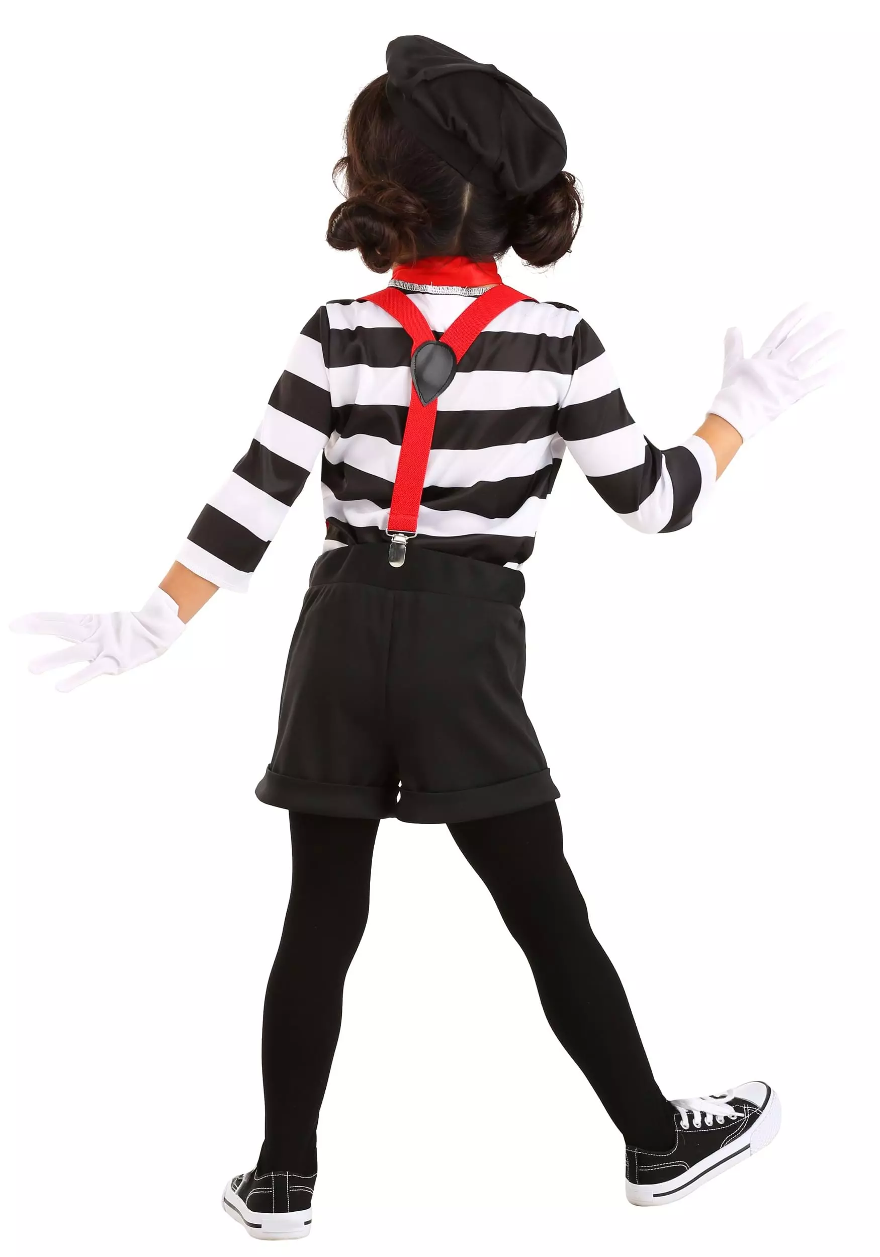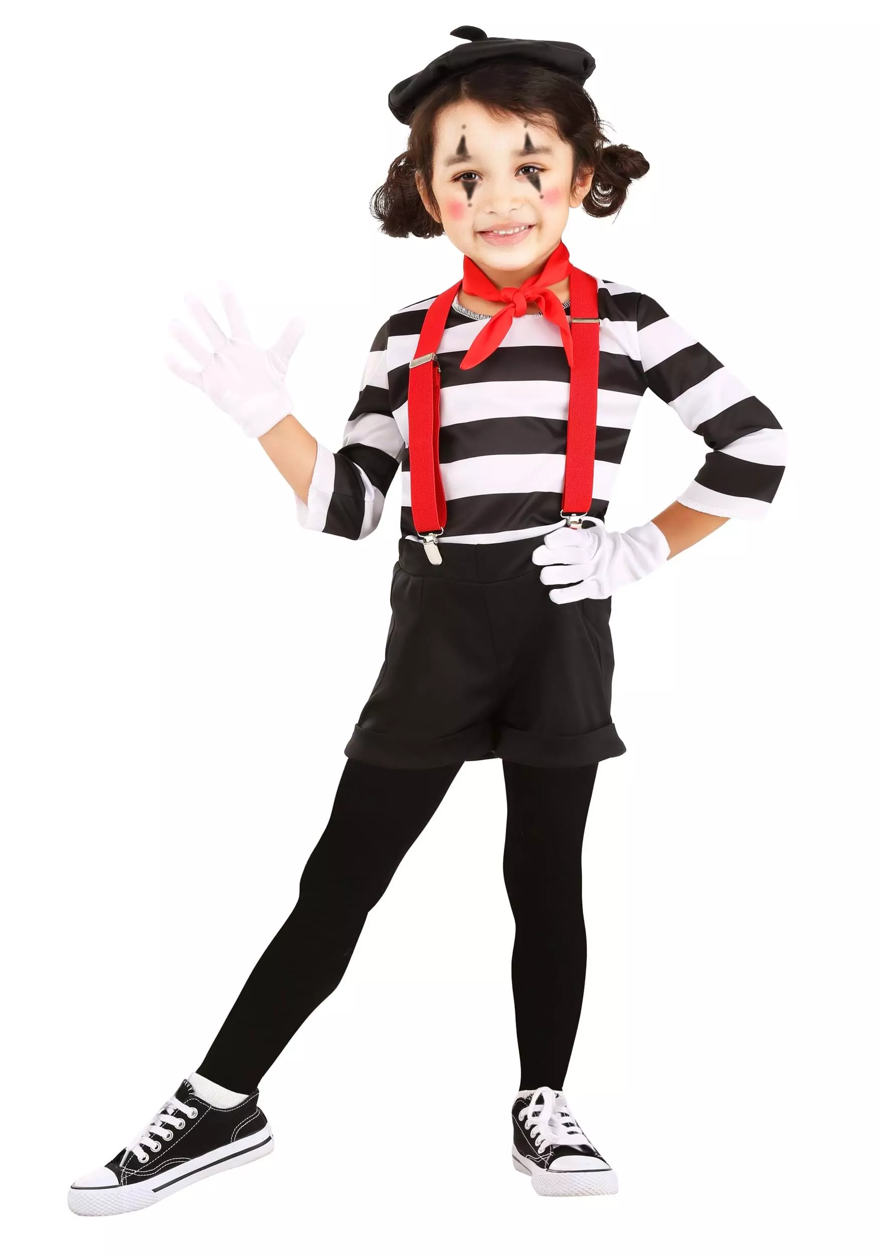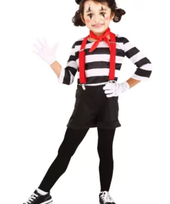 Amuse your friends at your next costume party with this funny, exclusive Toddler Mime Costume. The outfit looks like a traditional mime costume and is made from comfy, 100 percent polyester jersey knit fabric. The striped pullover shirt has 3/4-length sleeves, while the black shorts have turned-up cuffs and an elastic waistband for a comfy fit. The shorts also have length-adjustable red elastic suspenders attached to the waistband. The costume comes with a red necktie and a an adorable black beret… since no mime is really a mime if they don’t have a cute beret!