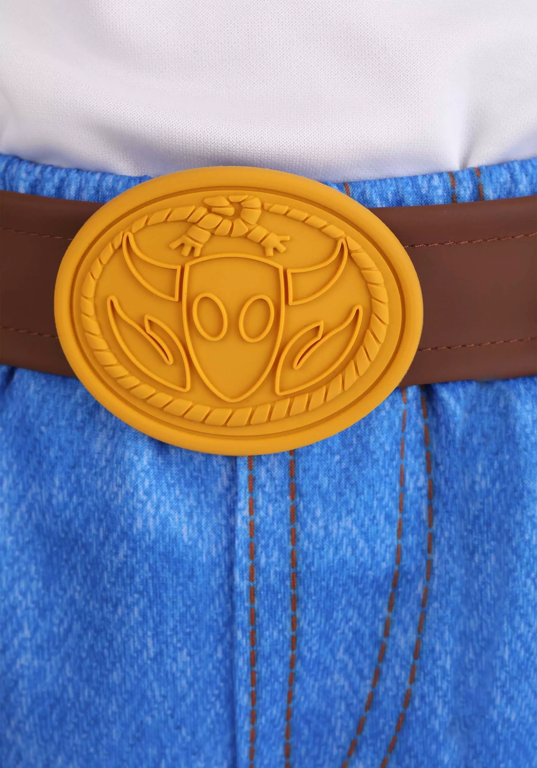 The ensemble begins with a jersey shirt that ends in fringed cuffs. It is printed to take on Jessie’s iconic blouse, so you have no struggle with layers. The pants continue the easy Jessie transformation, printed with a denim and cowhide style. Felt at the knees and a faux leather belt completes this style and the cowgirl hat tops it off! All your cowpoke needs to supply is the yodeling skills.