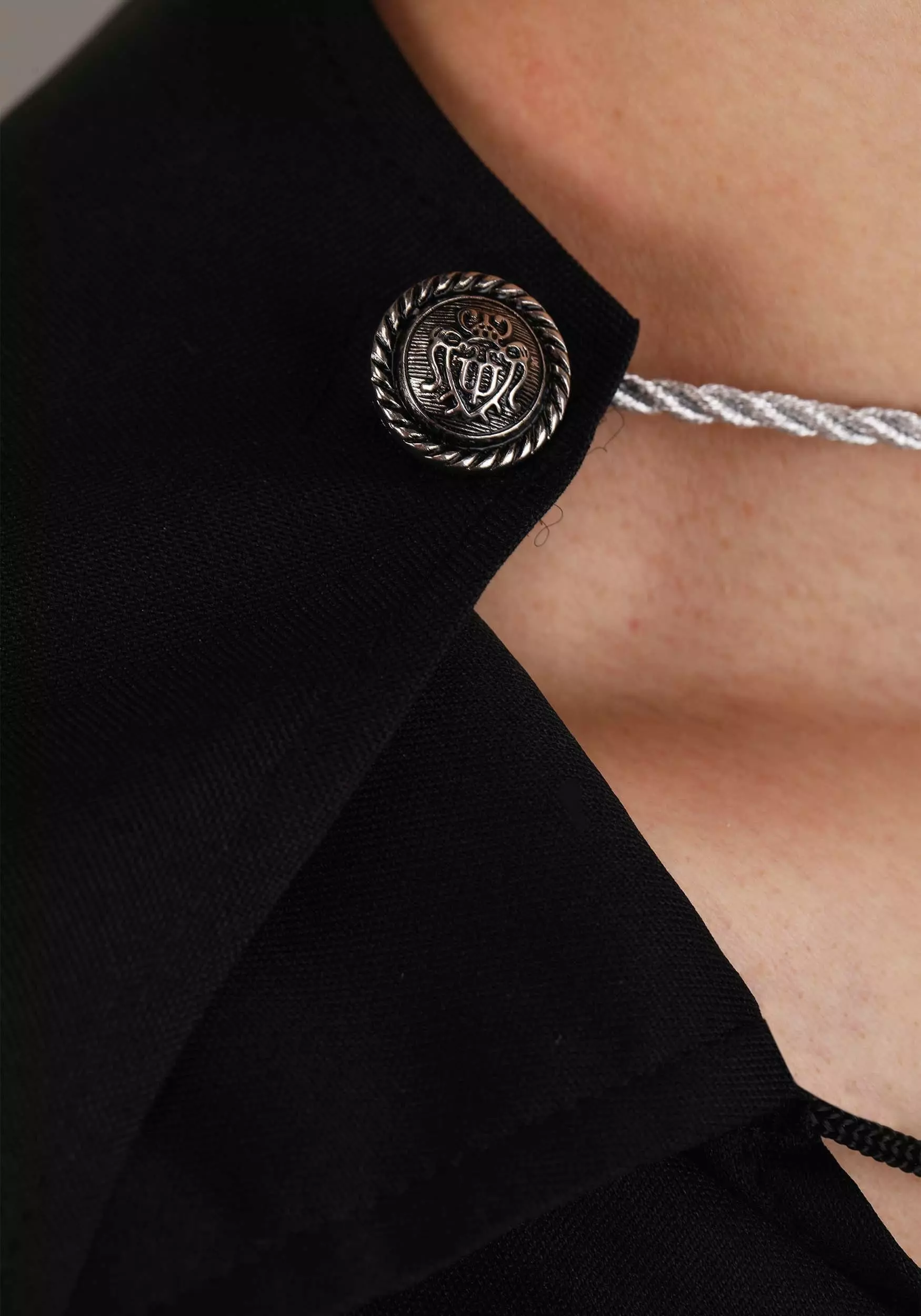 - Poplin cape has silver cord w/ hook & loop fastener at front neck; cord is anchored by decorative silver-tone metal buttons