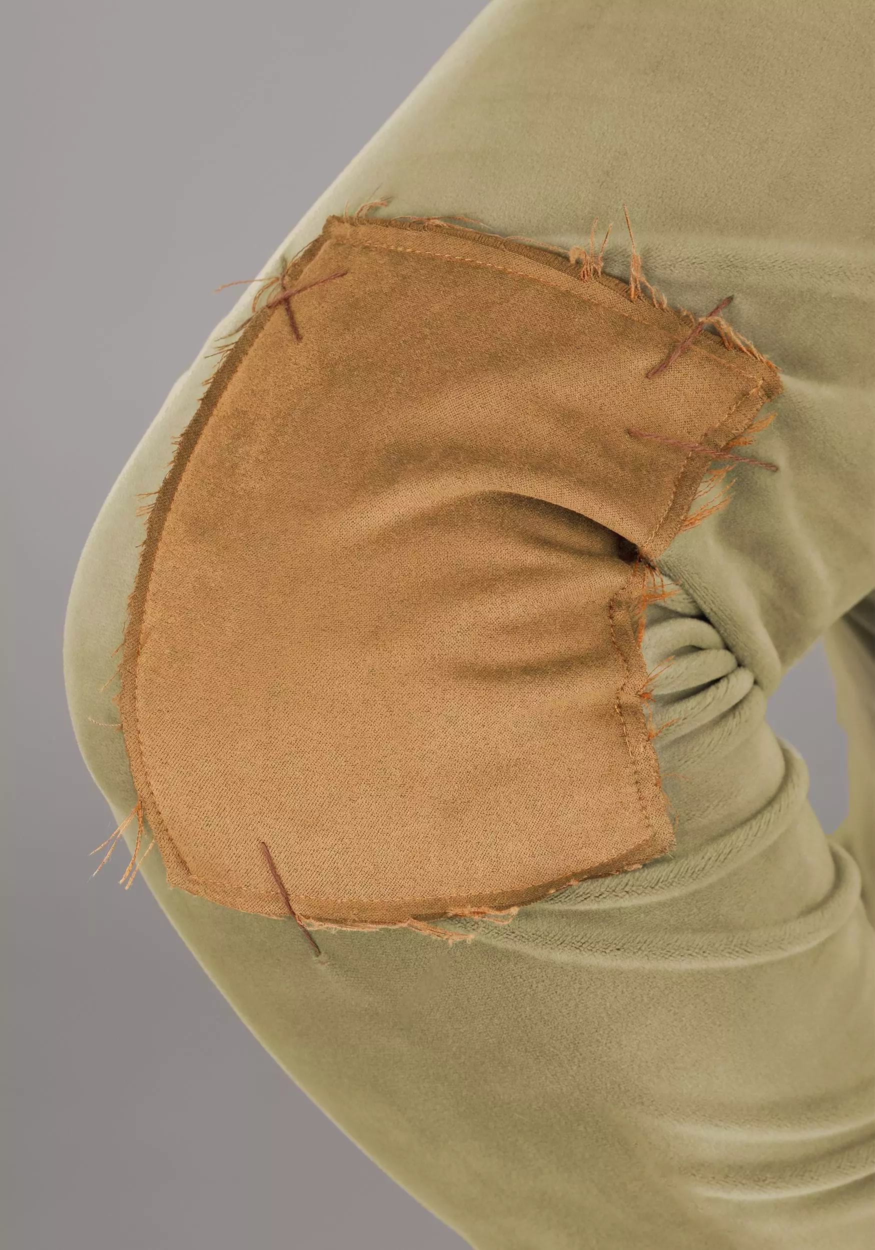 - Cuddle plush shirt has snap button closure on the back, faux suede patches, felt buttons