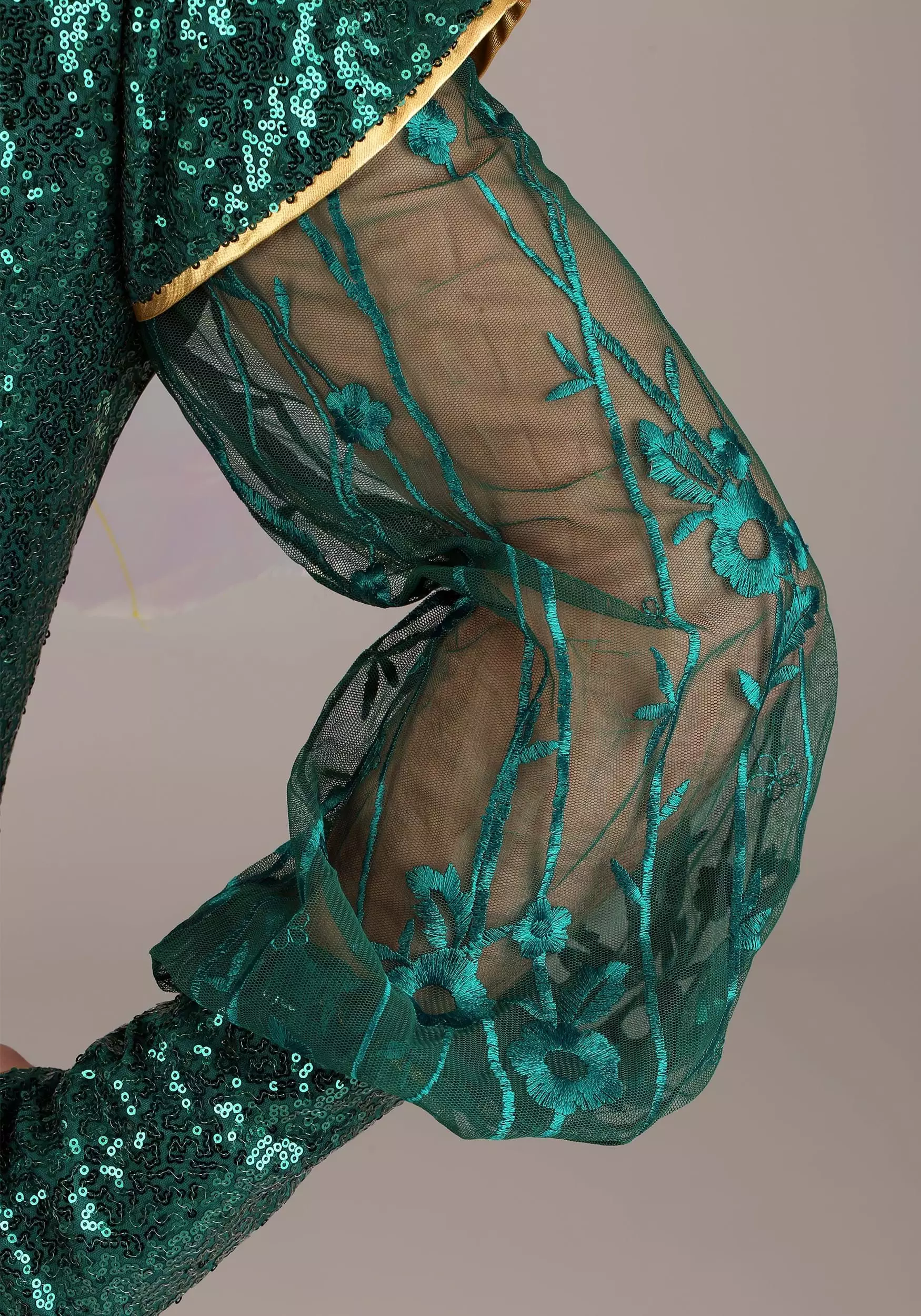 - Puffed sleeves are floral embroidered mesh w/ fitted cuffs that close w/ hook & loop fastener