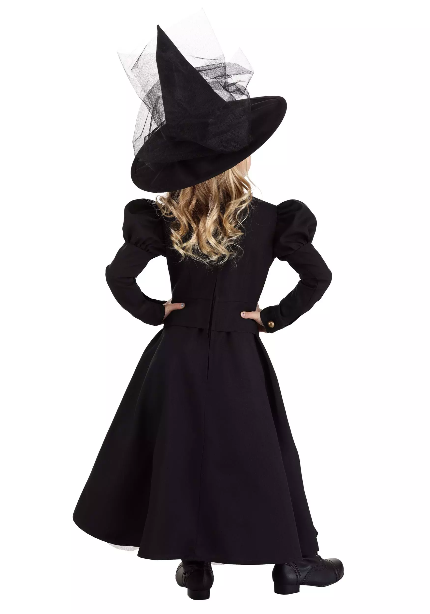 Your toddler will look devilishly sweet in this Girl’s Deluxe Classic Witch Costume for Toddlers! The exclusive outfit includes a long black poplin dress that zips up the back and is styled to look like a jacket over a skirt. The princess-cut bodice has a high collar and gold-tone buttons marching down the middle. The leg o’ mutton sleeves are adorably old-fashioned and pair well with the sweeping skirt. An included black petticoat is sewn with layers of tulle to give the skirt extra body. Add the tall, pointy witch hat with its mesh sash!Â