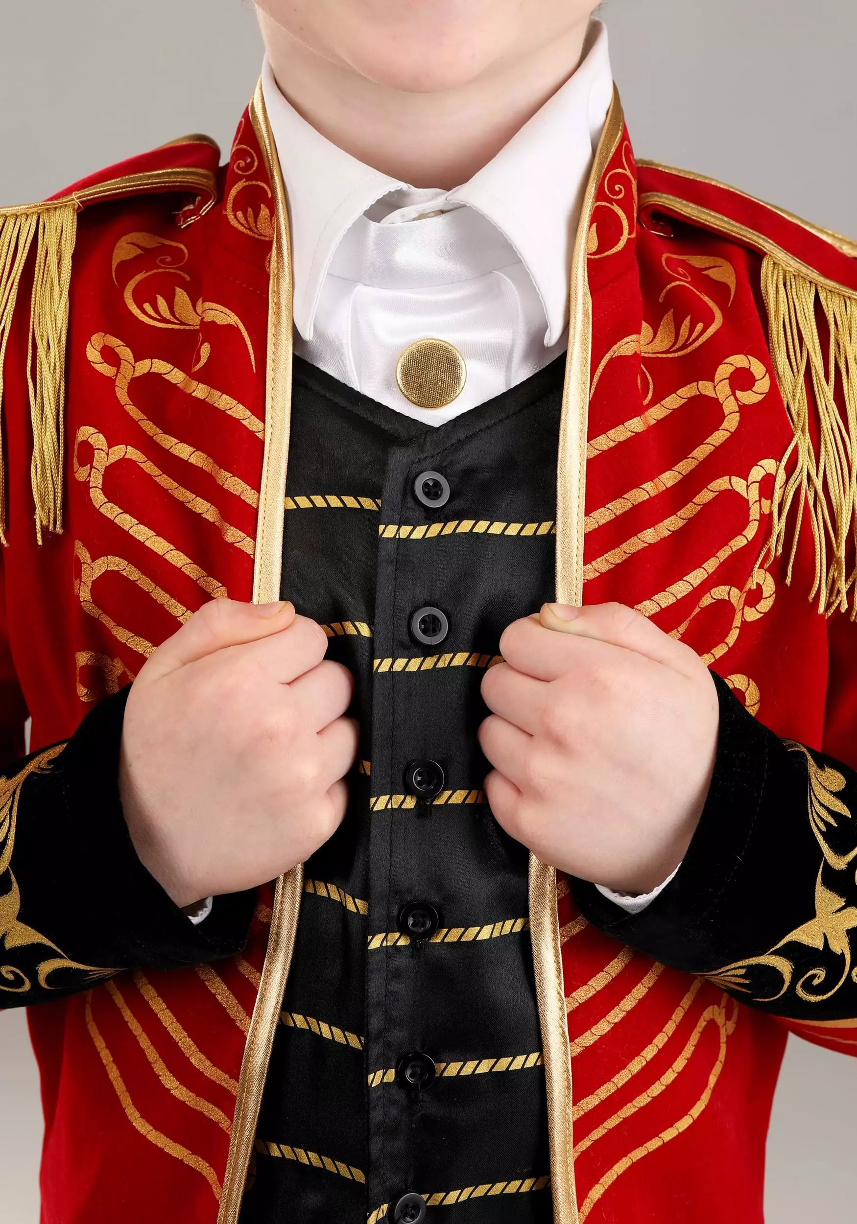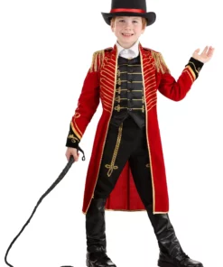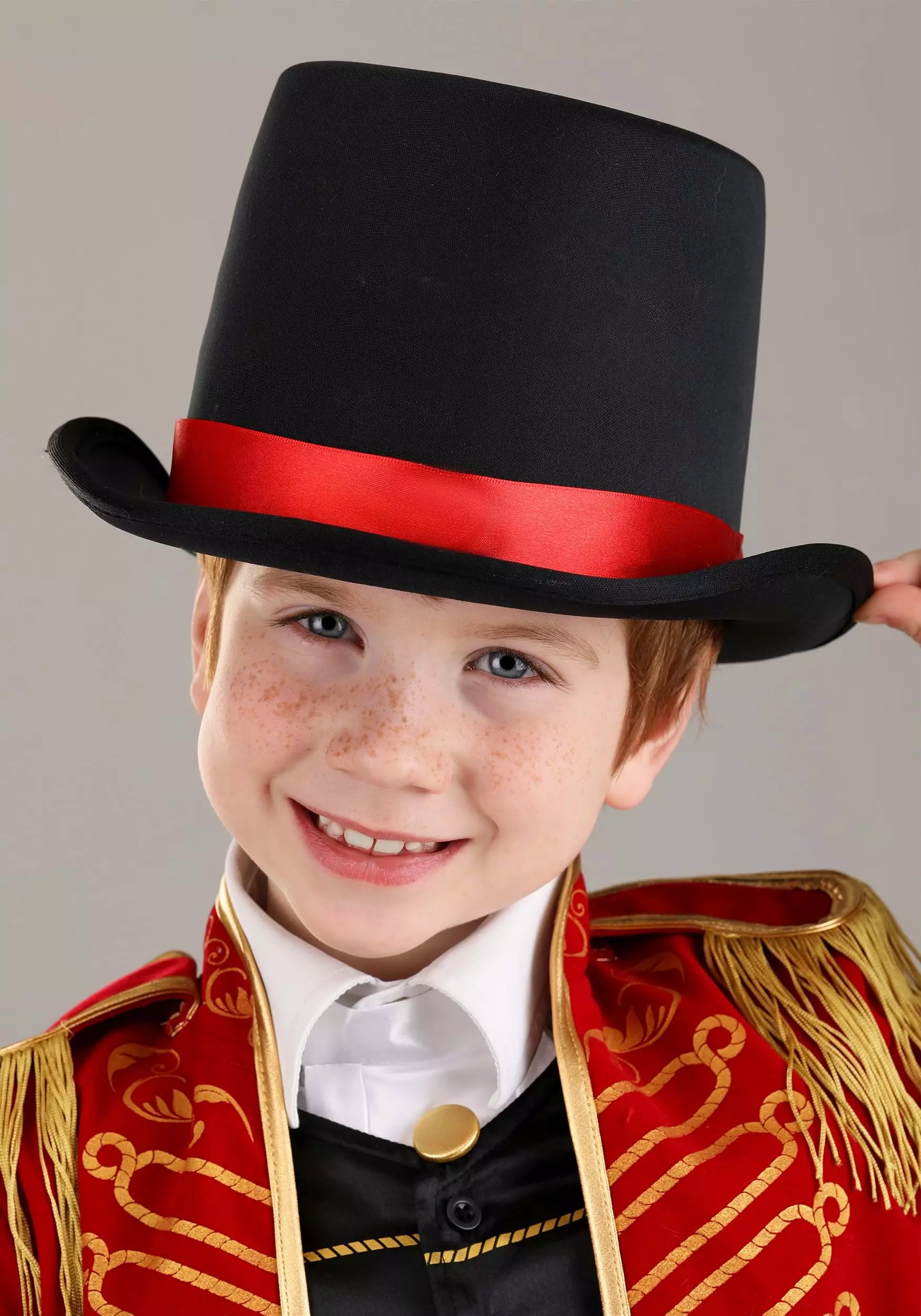 Captivate crowds and head the greatest show on earth with our exclusive Kid’s Dashing Ringmaster Costume! The outfit includes the essentials starting with a long with attached vest panels. The red velvet portion of this easy-to-wear top features shoulder epaulets with golden fringe and printed black and gold details down the sleeves and front. The black satin vest panels have functioning buttons to secure the jacket and gold-printed frogging.