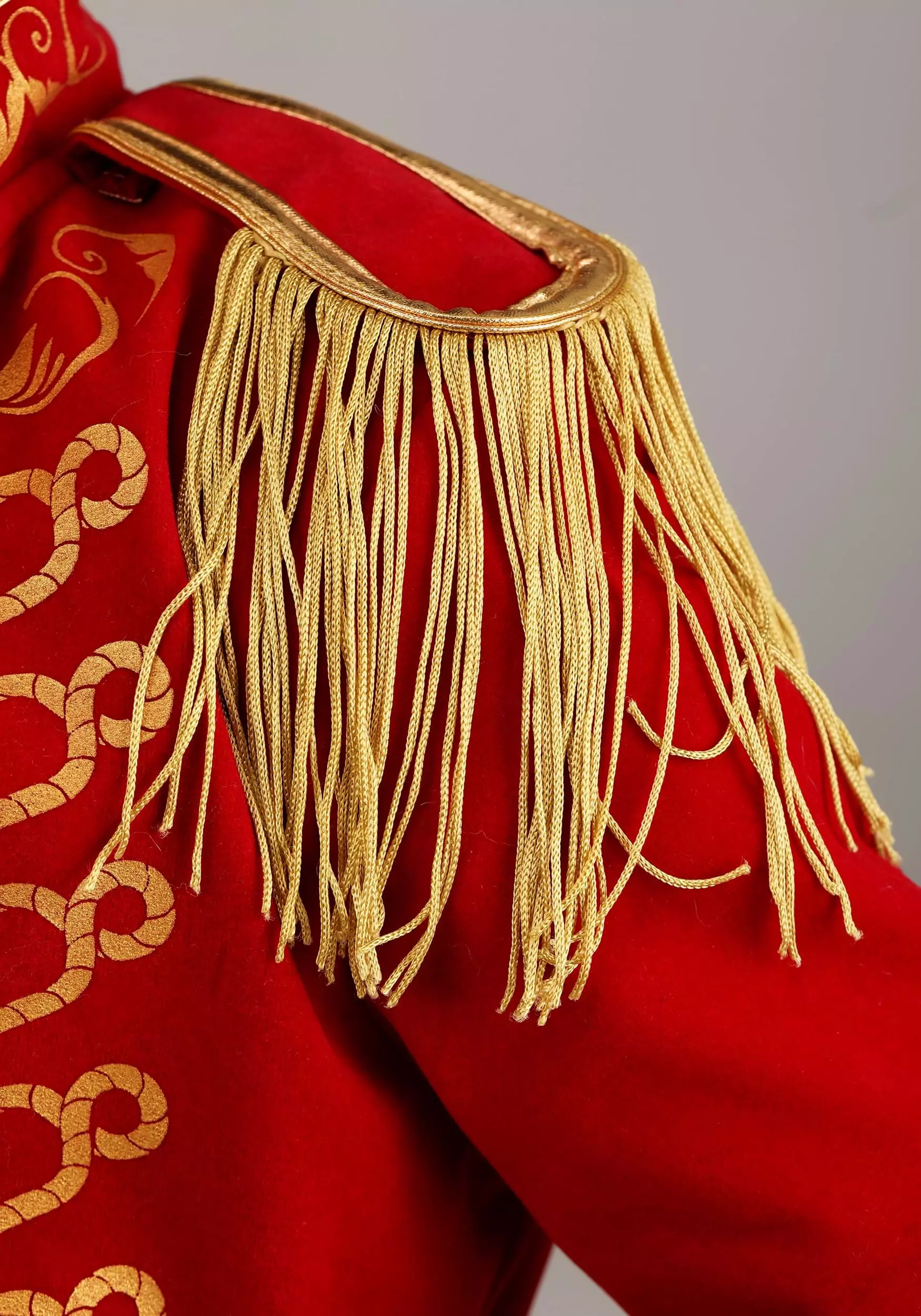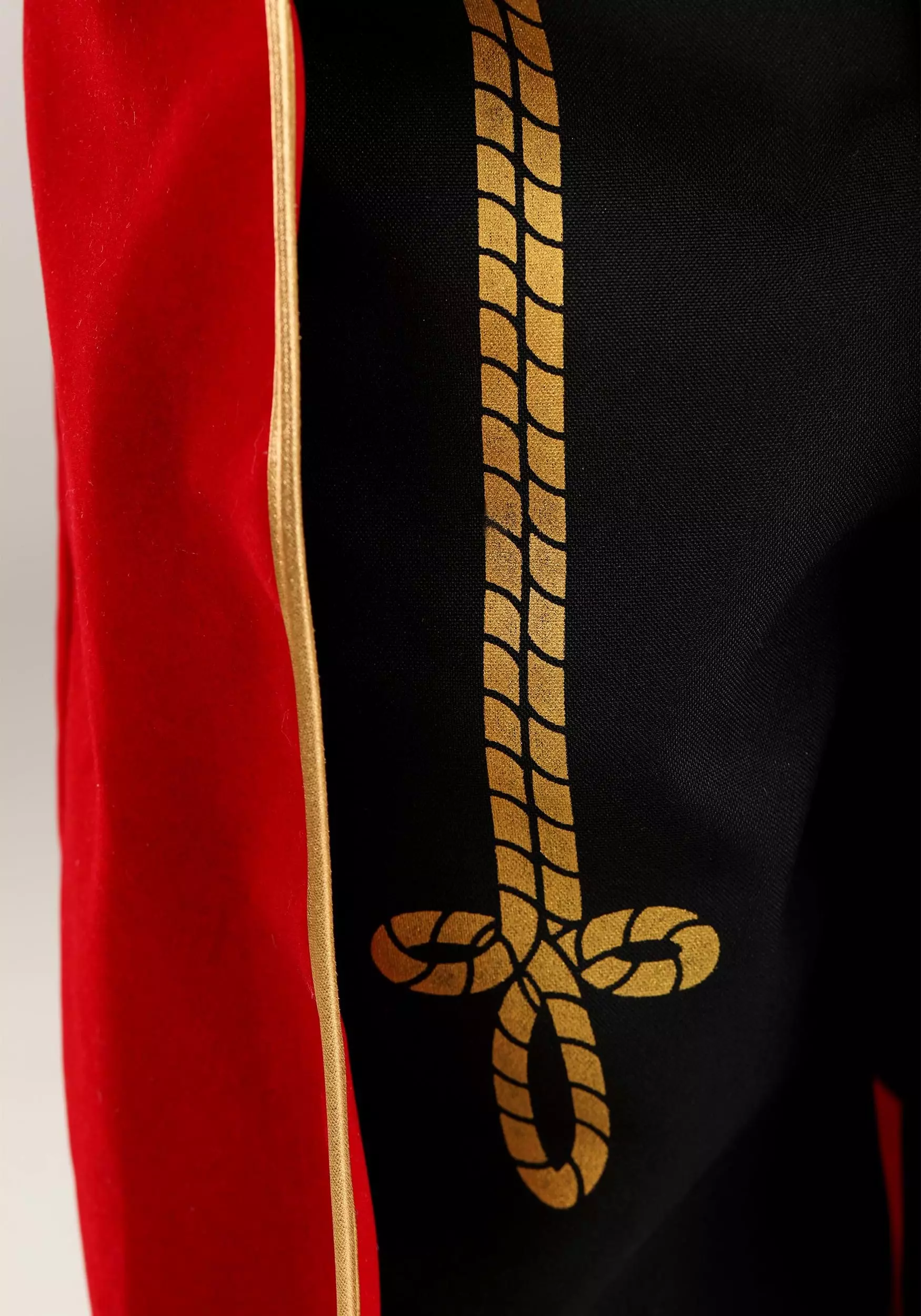 A pleated satin cravat wears under the combo jacket with a hook-and-loop fastener at its back. A pair of black pants feature the same printed frogging as the vest. Completing the look is a pair of black faux leather boot covers and a black top hat with a red ribbon band.