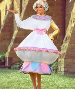 This Women’s Disney Beauty and the Beast Mrs. Potts Costume is ready to help you look the part! The costume starts with a white and pink dress modeled after Mrs. Potts’s iconic china pattern. It even has a purple collar to recreate her lid and the skirt has a rounded teapot appearance. Finally, the costume comes with a pink and gold hat to neatly finish off the whole look.