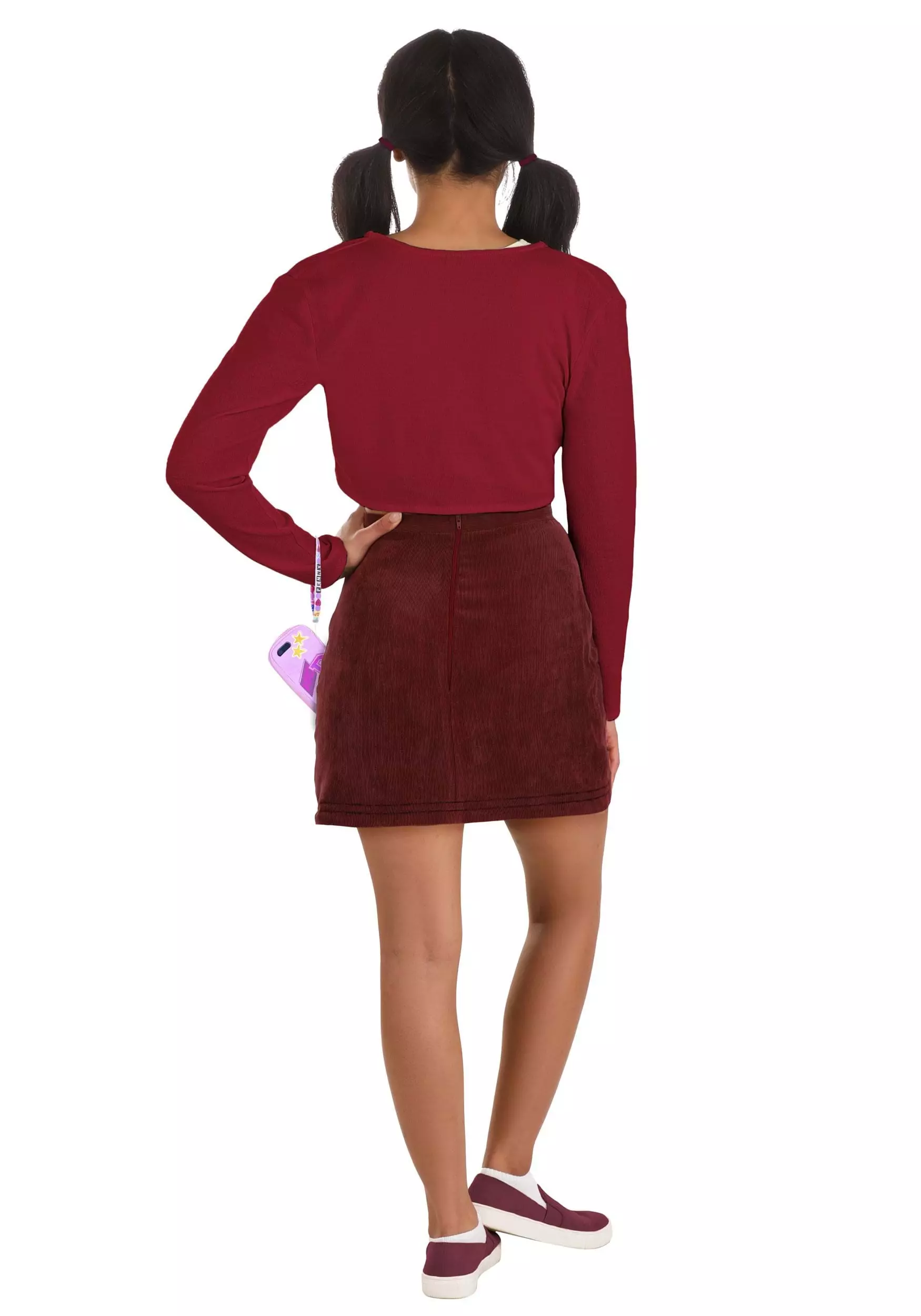 You’ll start with a long-sleeved maroon cardigan worn over a stretch-knit, white top. The burgundy skirt has a corduroy style that zips up in the back and matching hair ties allow you to wear your hair just like Penny. Keep in contact with the fam with the wrist strap phone case and write a proud story for you and yours today!