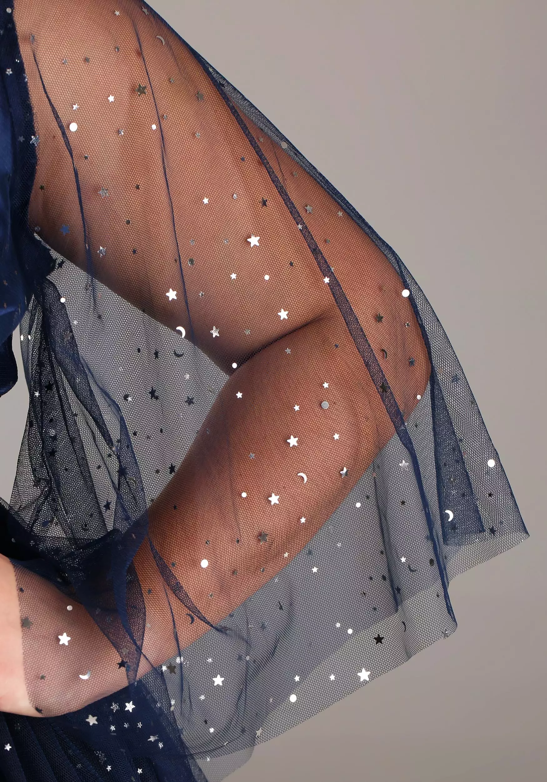 - Bodice has overlay of tulle spangled with small metallic silver stars and moons