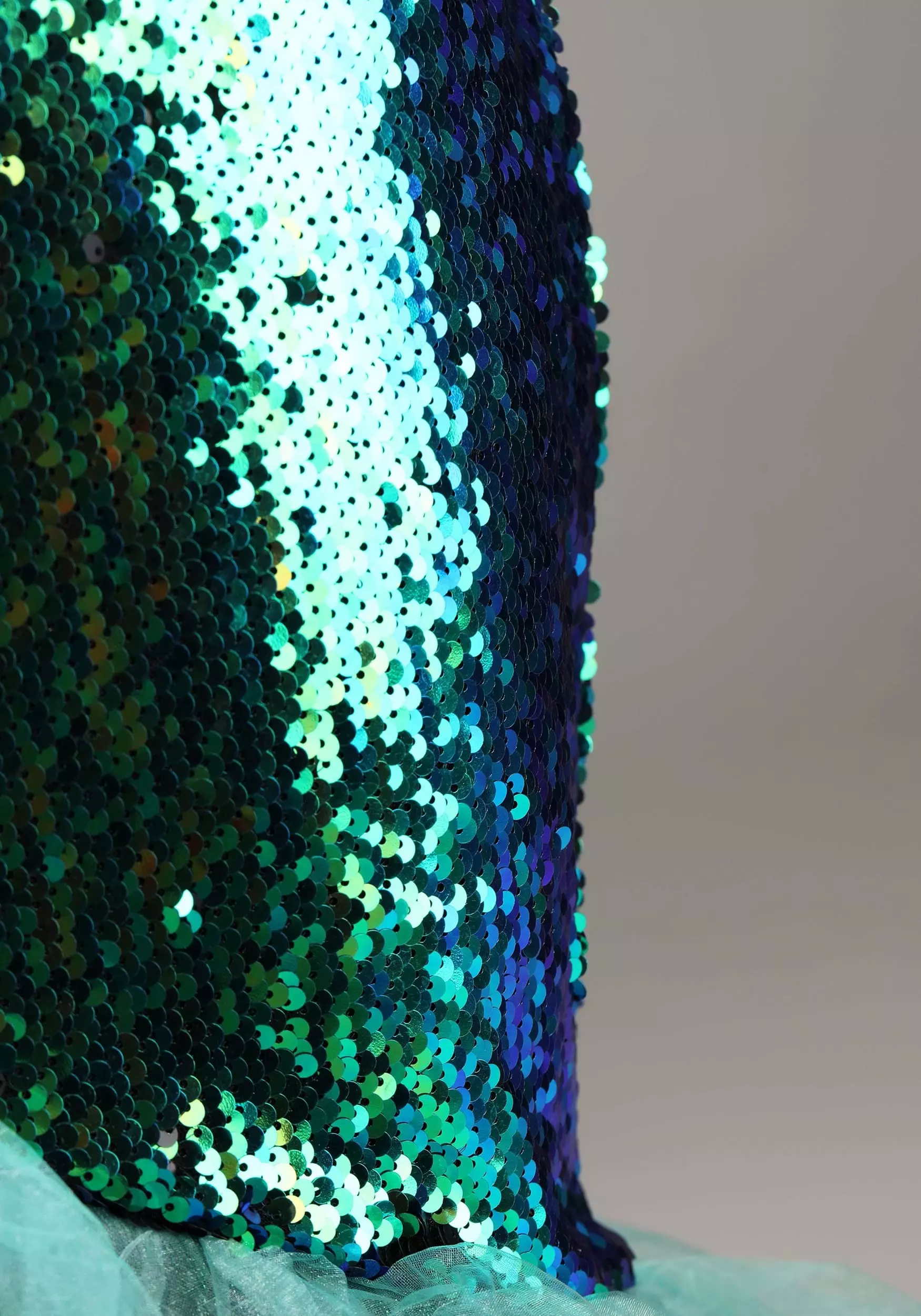 - Dress is form-fitting above knees, covered w/ iridescent sequins