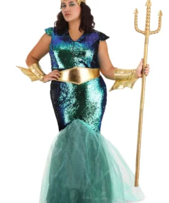 We’ve spoken to a historian who is an authority on the Mermaid Wars and he was able to give us an idea of what mermaid warriors looked like back then. Our designers worked day and night to recreate a costume that best depicts the mythological species’ attire. Our women’s sea siren costume is modeled after the historian’s explanation. You’ll be draped in sea foam colored sequins, gold wrist cuffs, a matching belt, and a jeweled headpiece. You’ll look legendary once you complete your transformation into sea siren royalty!
