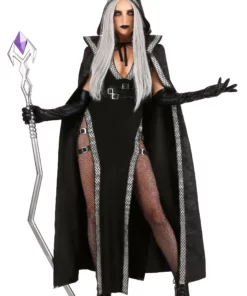 Of course, modern witches deserve a modern wardrobe. A wardrobe that alludes to their powerful past, while embraces their new metropolitan setting. That’s where this costume comes in! Designed by our in-house creative team, this flowy look is trimmed in silver brocade and accented with head-swiveling details. The dress, neck cowl, and cloak can be worn separately or together. The featured dress has attached faux-leather belts cinching the waist in while matching buckles add an edgy touch to the slits on the skirt. The hood has a heavier, aged leather texture with sculpted shoulders and a drooped hood that gives its wearer a mystical silhouette.Â