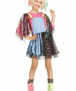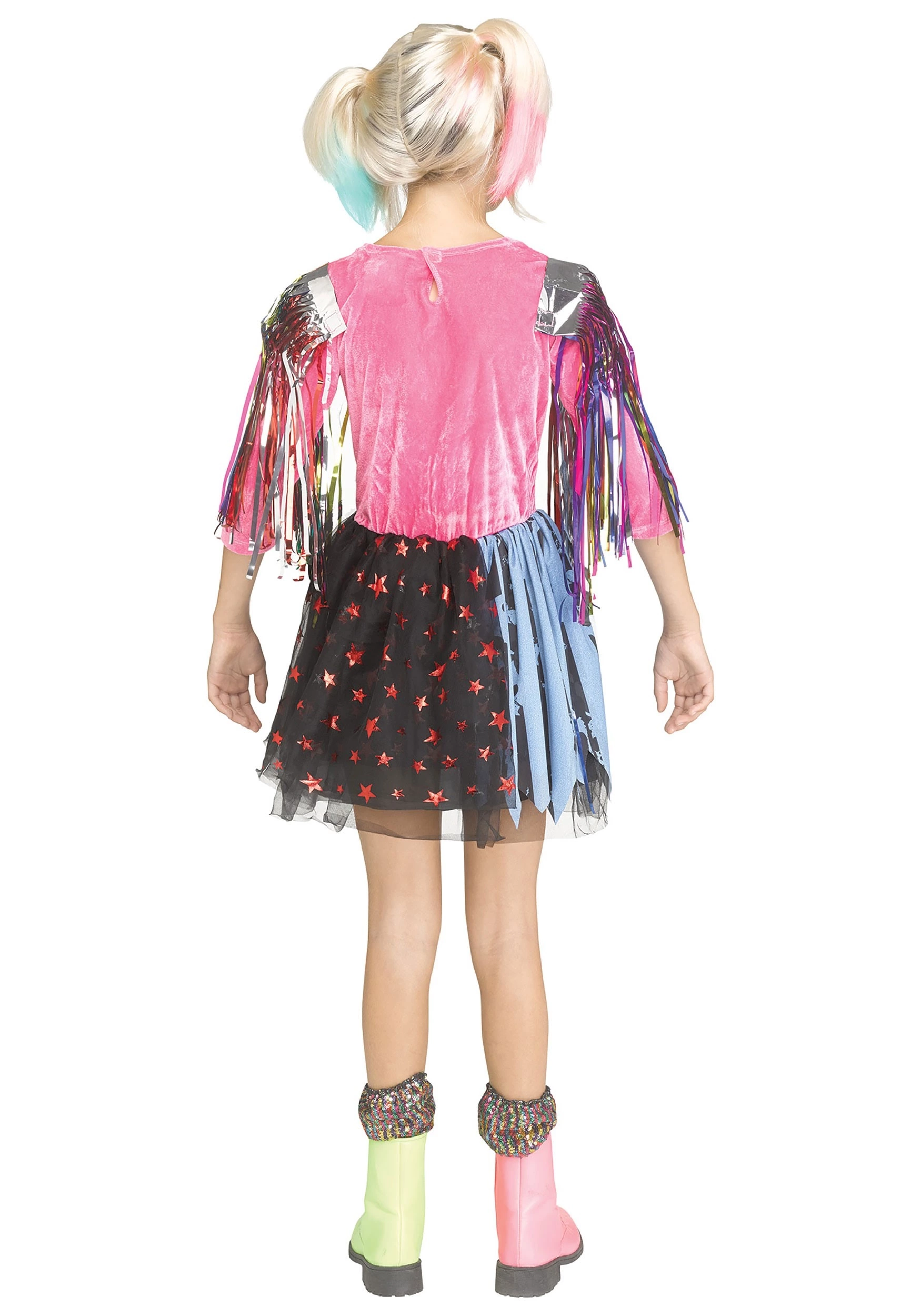This dress is all about mixing sparkles with rough edges. The overalls style on the front is actually attached to the pink shirt underneath. The skirt portion of the dress is half ragged blue stripes, half black tulle and pink stars. We especially love the tinsel epaulettes on the shoulders, each featuring different colors from the other. They attach to the dress with velcro type fasteners. We recommend going with mismatched shoes for a Harley Quinn look, or go with actual roller skates if you like!Â