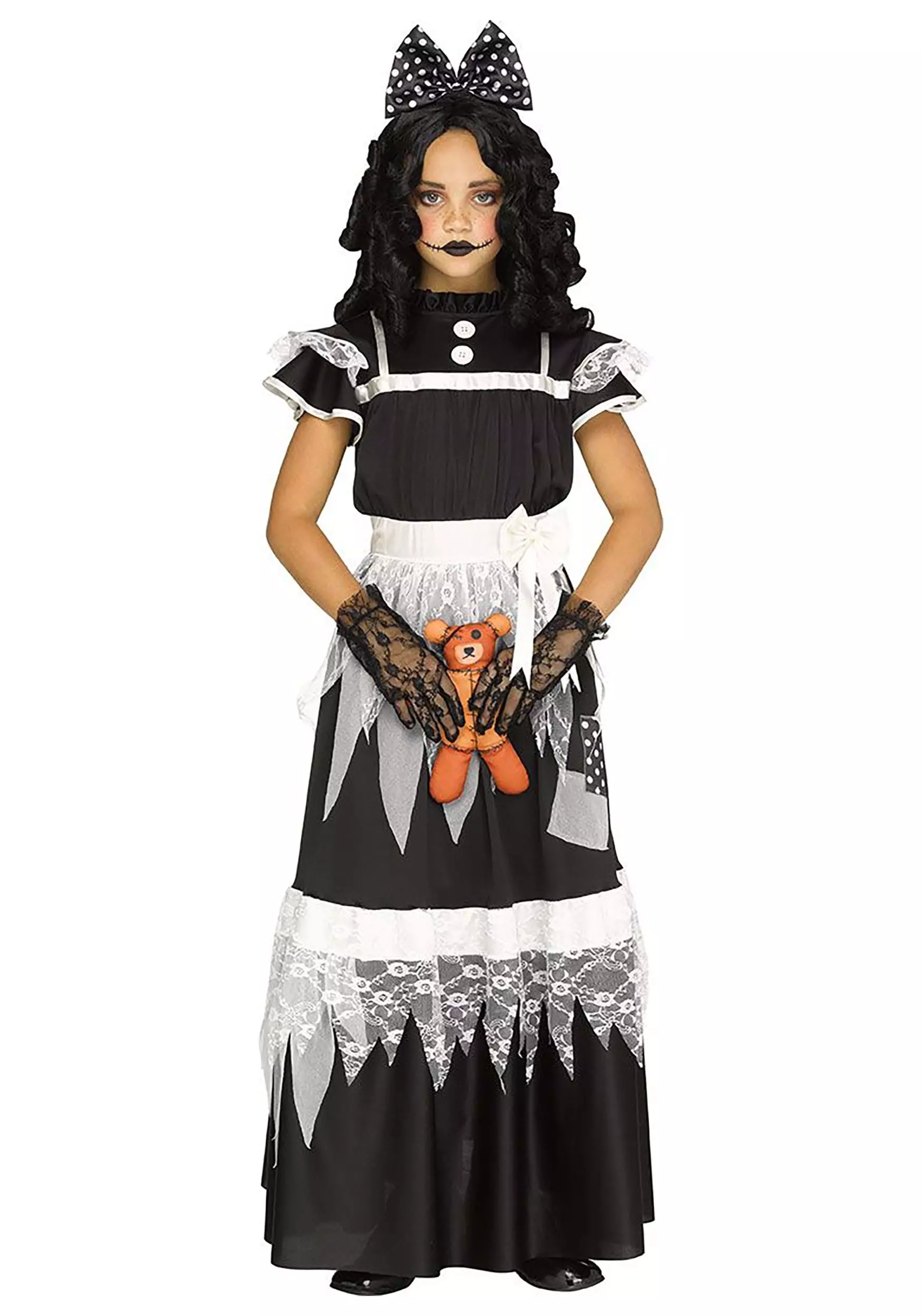 Is that doll….alive? Yes, it is, if the doll is you wearing this Girl’s Victorian Deadly Dolly Costume! The ankle-length vintage gown looks exactly like what a possessed toy would wear. Short, ruffly sleeves complement the decorative ribbons and buttons on the bodice and the sewn-on white sash. The black skirt features tiers of jagged lace and patchwork. Black lace gloves hide your bloodstained china fingers. The crowning touch is an oversized polka-dotted bowattached to a headband.Â