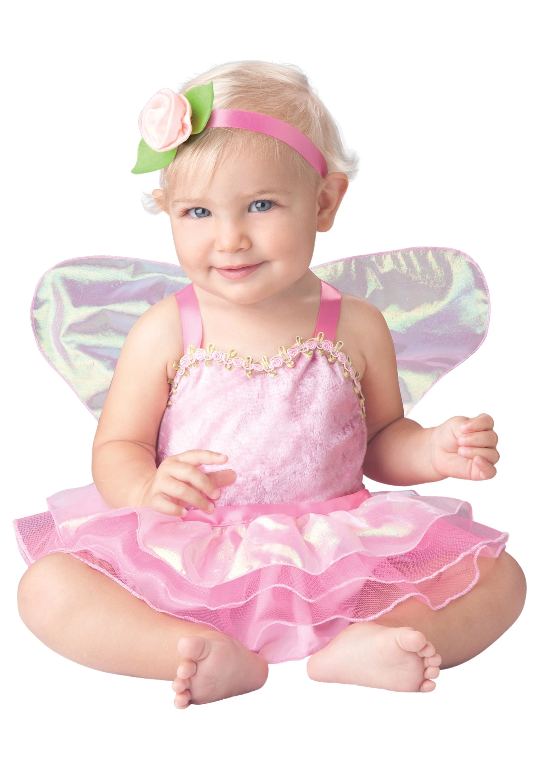 This pink ensemble is pretty and functional at the same time. The tutu is attached to the velvety bodysuit, which has metal snaps at the bottom for easy dressing and diaper changes. The irridescent wings attach to the shoulder straps with velcro type fastenings. As a final touch, the headband features a small rose and leaves on a pink ribbon, while the back is elastic for security. Depending on the weather or event, you can easily add layers to this look for warmth, and shoes if your little one is walking about.