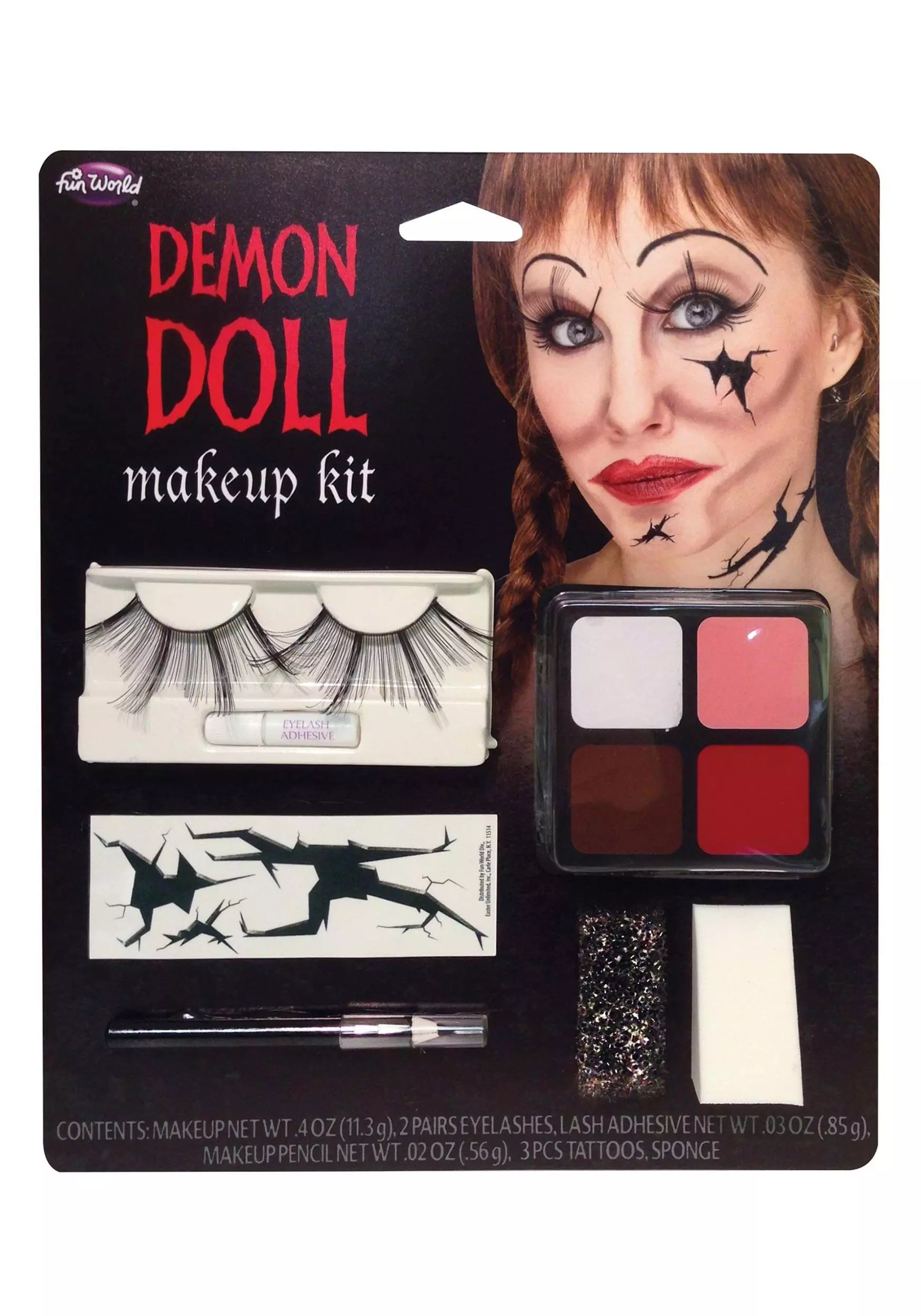Channel your inner evil diva with this Demon Doll Makeup Kit! The kit includes everything you need to look just like the most nightmarish toy in the playroom. Assorted blush and contouring hues give you those doll-like rosy cheeks, and the fake eyelashes accentuate a glassy stare that screams “You’re next!” Complete your transformation with fake “cracks” to show the havoc that wreaking violence has played on your porcelain skin.Â
