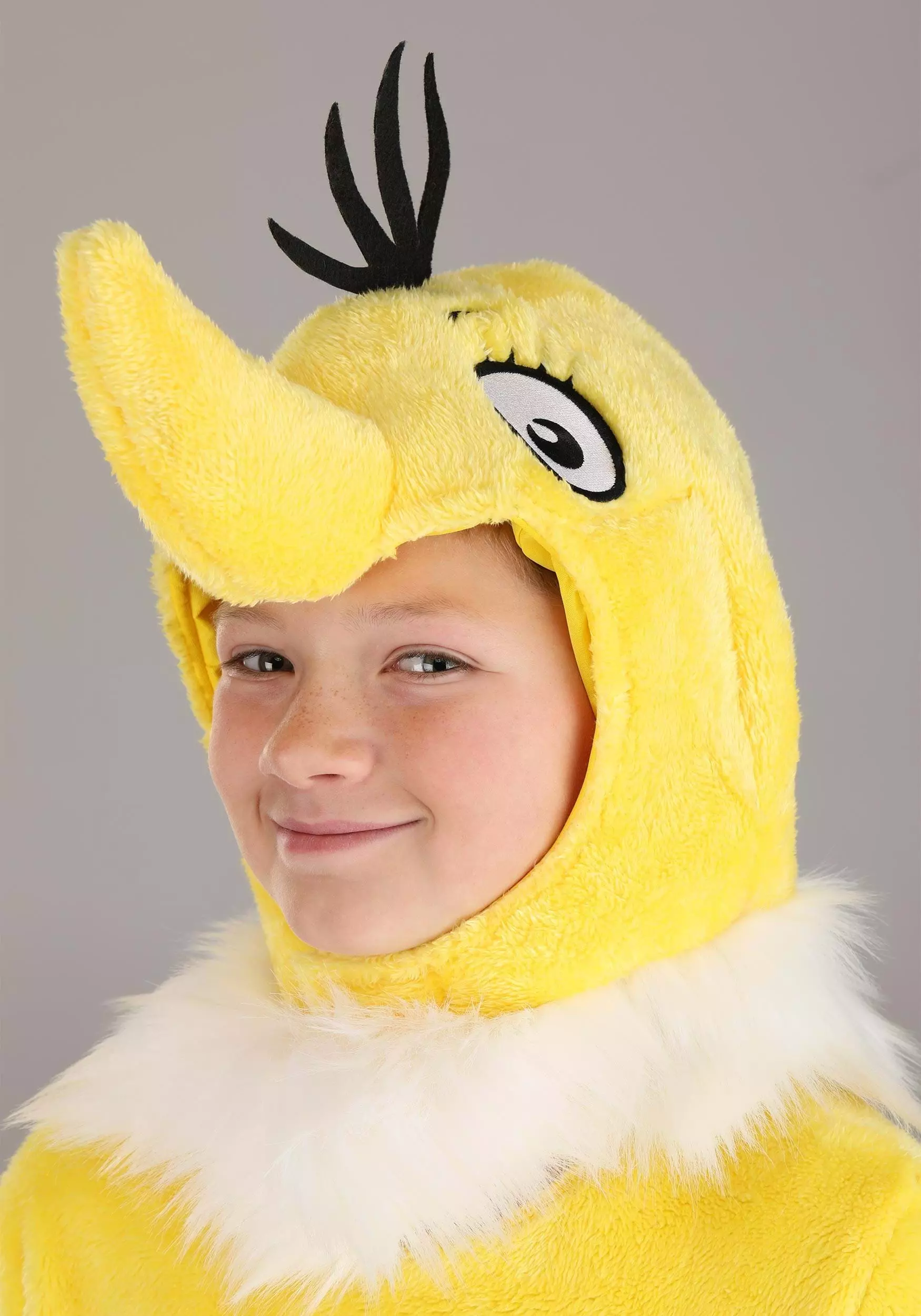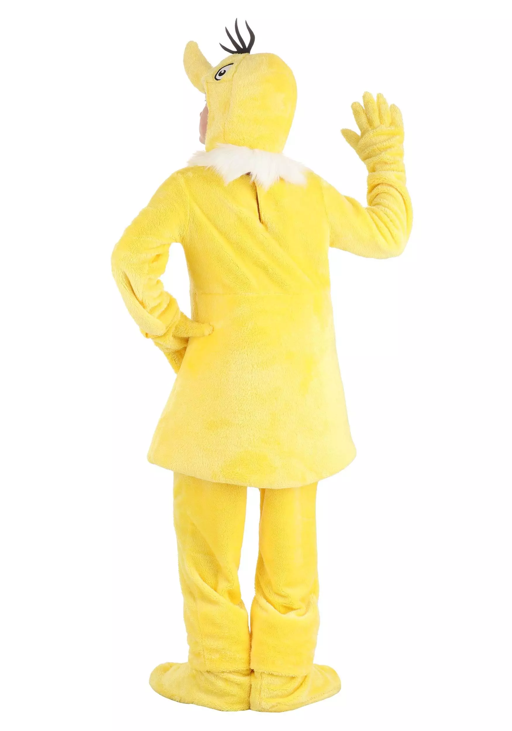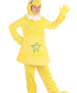 Don’t let differences get in the way of making new friends when you wear your exclusive, officially licensed Kid’s Dr. Seuss Star Bellied Sneetch Costume for Kids! The long-sleeved tunic fastens at the back of the neck and is made of sunny yellow velour. An appliqued green star is affixed to the front just above the foam-backed bubble hemline. The matching yellow velour pants feature a comfortable elastic waistband. The velour hood fastens beneath the chin and is decorated with embroidered eyes, a black felt tuft, and a stuffed beak. Slide on the yellow velour gloves and socks to blend in with the rest of the Sneetches.Â